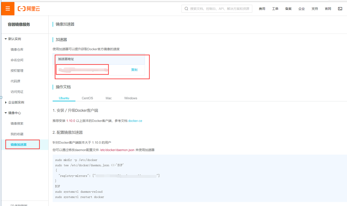 浏览器打开http://cr.console.aliyun.com,注册或登录阿里云账号,点击左侧的镜像加速器,将会得到一个专属的加速地址,而且下面有使用配置说明:
