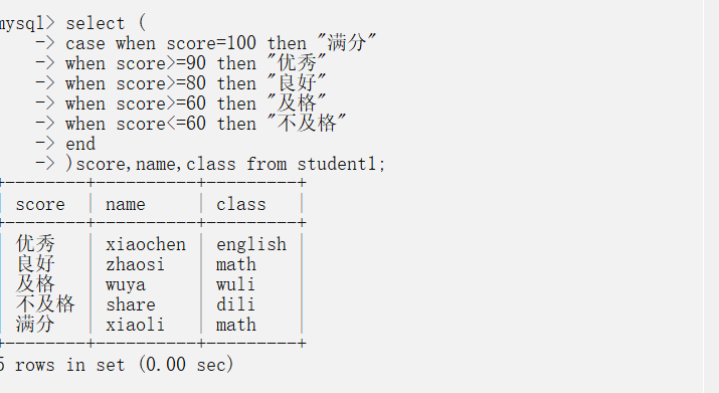2,需求:根据学生表的学生成绩,把学生成绩按照不同分数段分为满分,优秀,良好,及格,不及格