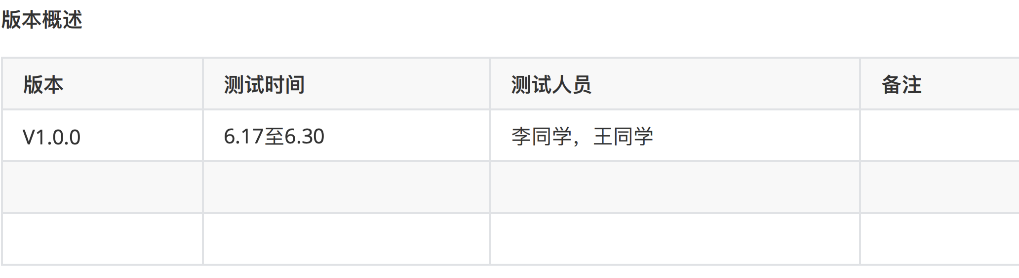 1、测试概述:版本,测试时间,测试参与人,备注