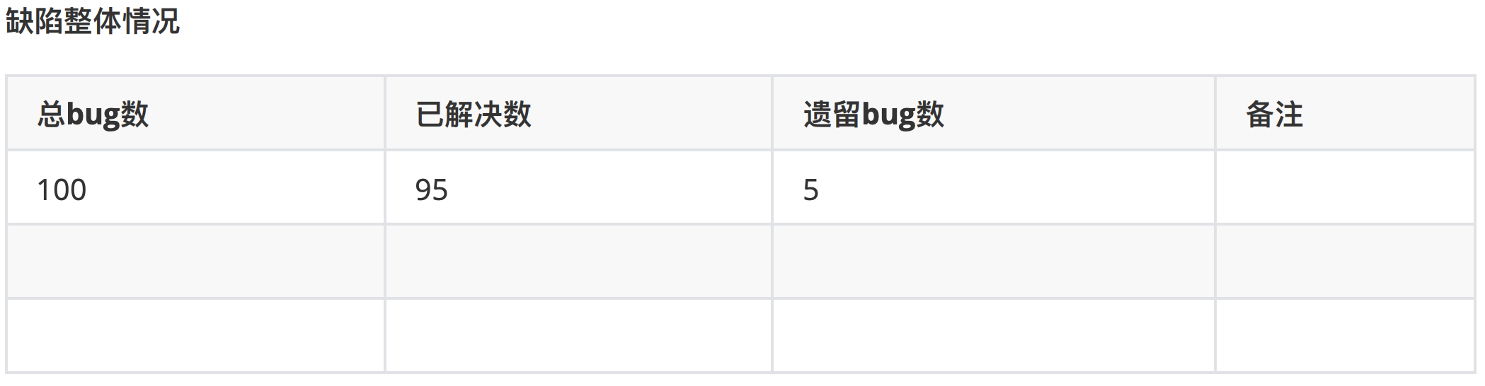 5、缺陷分析(总共有多少个BUG,解决了多少个,解决率是多少,未解决多少个)