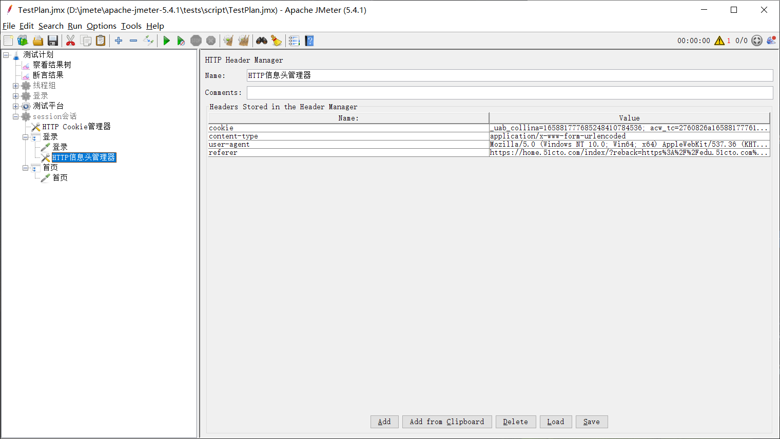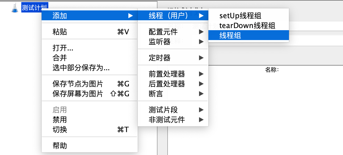1、首先在JMeter里面创建测试计划,在测试计划里面创建线程组