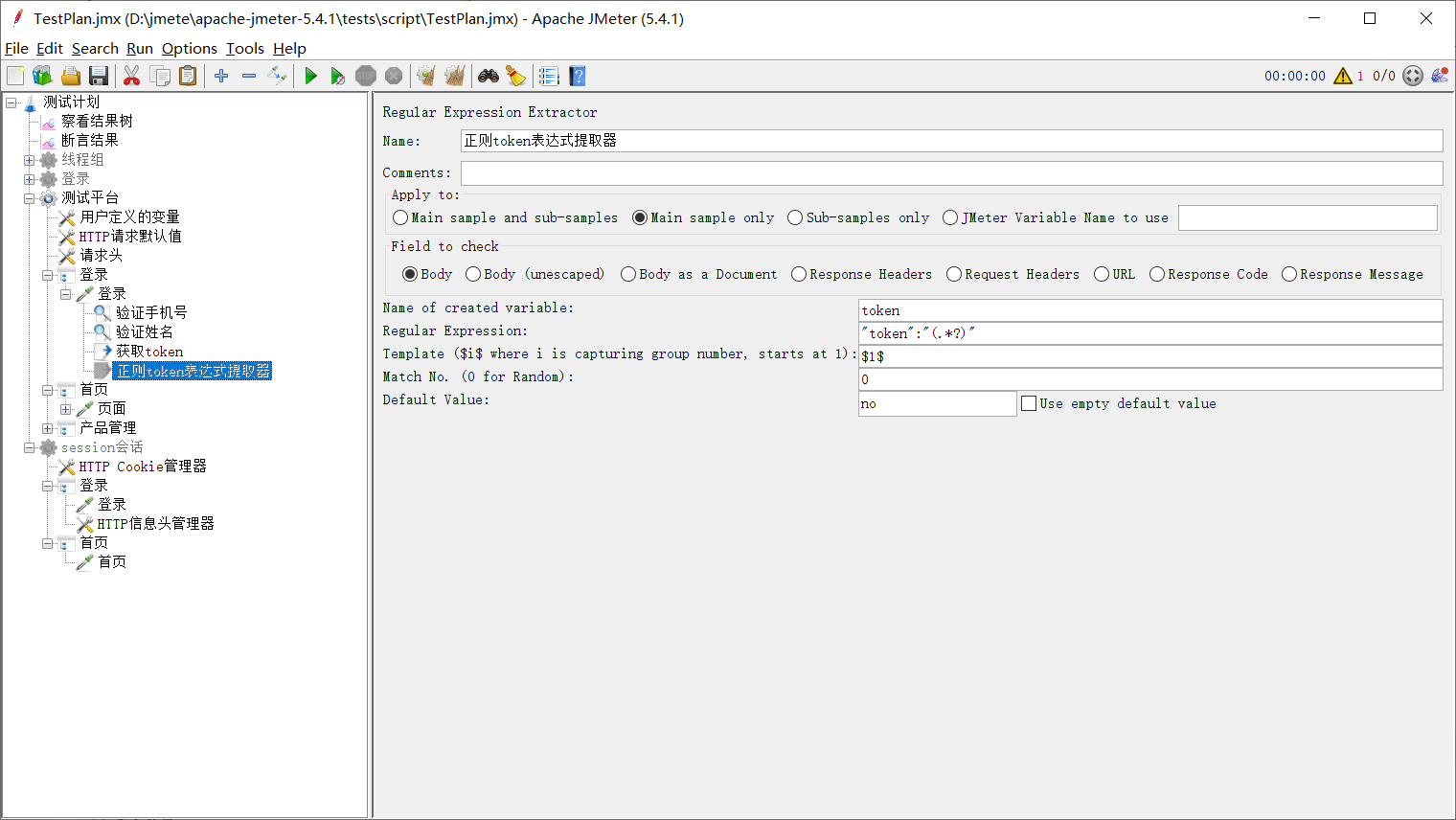 1、在登录的接口中添加后置处理器中的JSON提取器,定义一个变量获取登录成功后返回的token的值