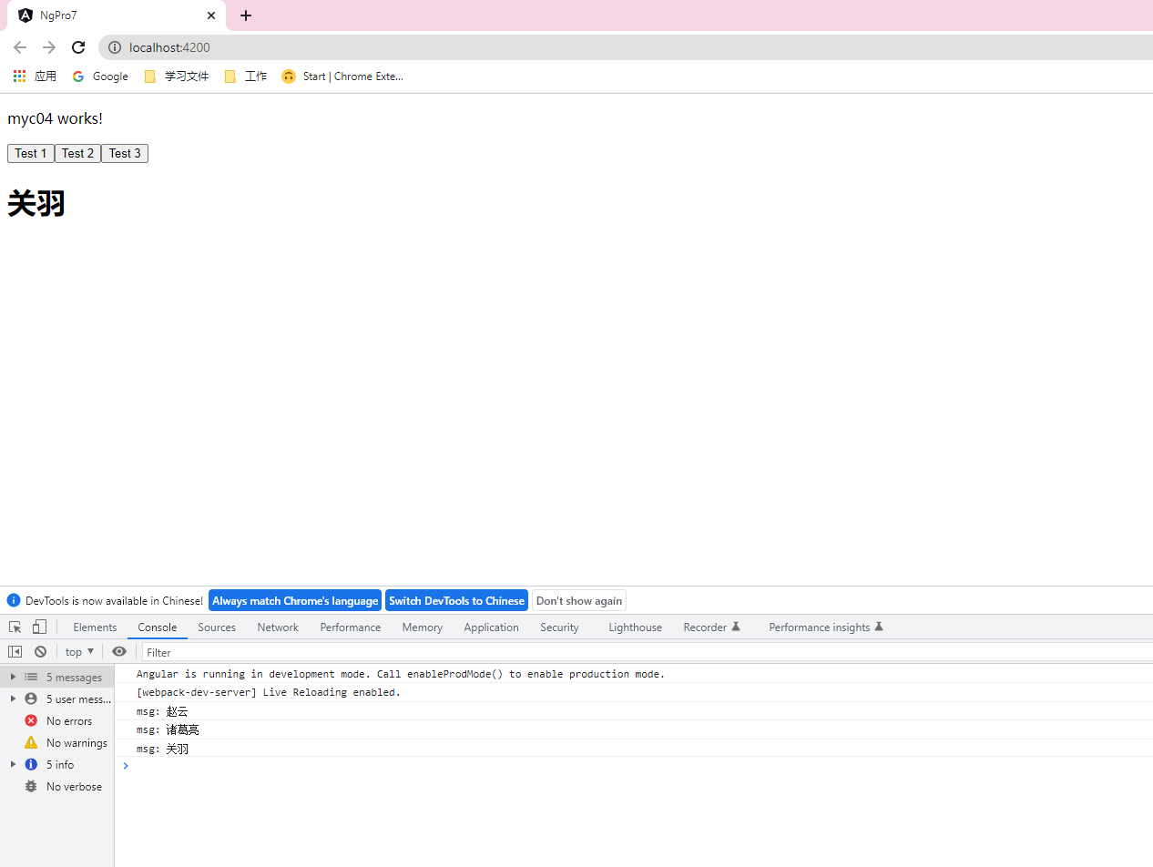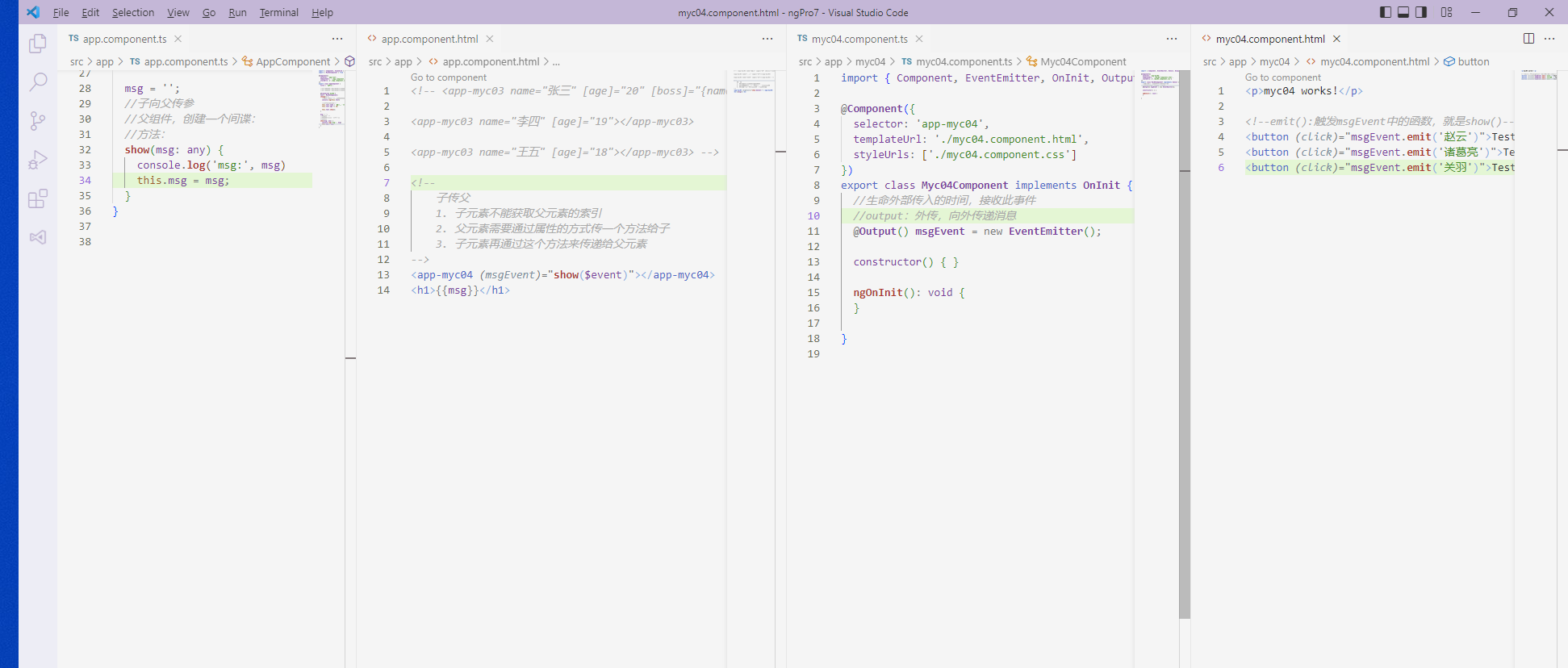 <p>myc04 works!</p> <!--emit():触发msgEvent中的函数,就是show()--> <button (click)="msgEvent.emit('赵云')">Test 1</button> <button (click)="msgEvent.emit('诸葛亮')">Test 2</button> <button (click)="msgEvent.emit('关羽')">Test 3</button>