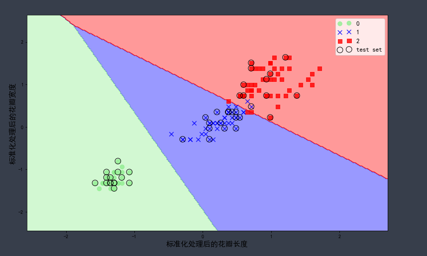 介绍:先定义一个可视化分类器模型决策区域的函数,用 iris 数据集划分训练集和测试集,并将特征值数据进行标准化,调用 scikit-learn 库的逻辑斯谛算法在划分的训练集上训练一个逻辑斯谛回归分类模型,在二维图像中绘制决策区域、训练样本和测试样本。