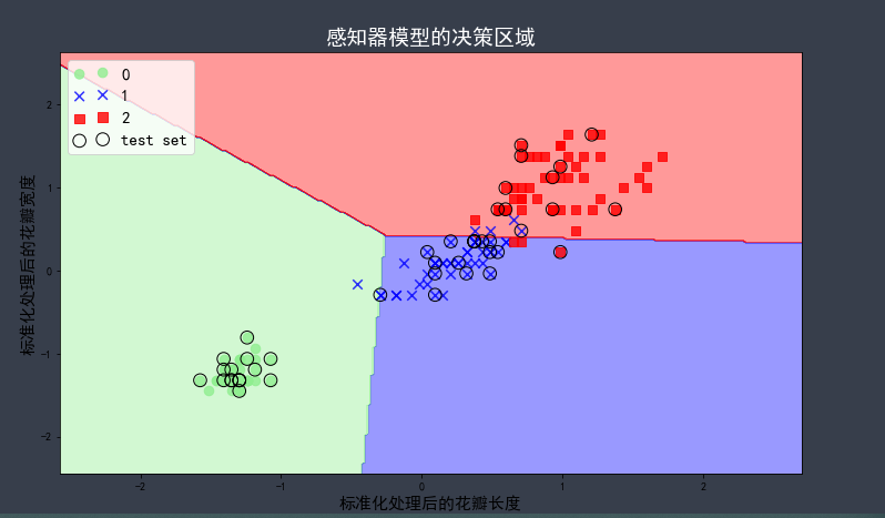 from sklearn.linear_model import SGDClassifier %matplotlib inline plt.rcParams['font.sans-serif'] = 'SimHei' plt.rcParams['axes.unicode_minus'] = False ppn = SGDClassifier(loss='perceptron') ppn.fit(X_train_std, y_train) # 将标准化后的训练数据和测试数据重新整合到一起 X_combined_std = np.vstack((X_train_std, X_test_std)) y_combined = np.hstack((y_train, y_test)) plt.figure(figsize=(12, 7)) plot_decision_regions(X_combined_std, y_combined, classifier=ppn, test_idx=range(105, 150)) plt.title('感知器模型的决策区域', fontsize=19, color='w') plt.xlabel('标准化处理后的花瓣长度', fontsize=15) plt.ylabel('标准化处理后的花瓣宽度', fontsize=15) plt.legend(loc=2, fontsize=15, scatterpoints=2) print()