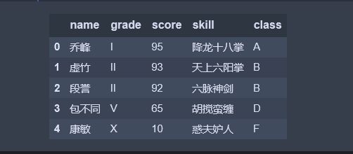 import pandas as pd df = pd.DataFrame([['乔峰', 'I', 95, '降龙十八掌', 'A'], ['虚竹', 'II', 93, '天上六阳掌', 'B'], ['段誉', 'II', 92, '六脉神剑', 'B'], ['包不同', 'V', 65, '胡搅蛮缠', 'D'], ['康敏', 'X', 10, '惑夫妒人', 'F']], columns=['name', 'grade', 'score', 'skill', 'class']) df