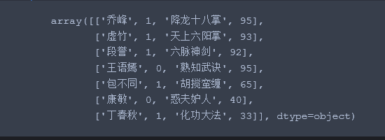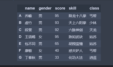 import pandas as pd df = pd.DataFrame([['乔峰', '男', 95, '降龙十八掌', '丐帮'], ['虚竹', '男', 93, '天上六阳掌', '少林'], ['段誉', '男', 92, '六脉神剑', '天龙'], ['王语嫣', '女', 95,'熟知武诀', '姑苏'], ['包不同', '男', 65, '胡搅蛮缠', '姑苏'], ['康敏', '女', 40, '惑夫妒人', '丐帮'], ['丁春秋','男', 33, '化功大法','逍遥']], index=list('abcdefg'.upper()), columns=['name', 'gender', 'score', 'skill', 'class']) df