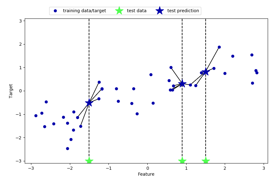 使用 k 近邻进行回归时,预测结果为 k 个邻居的平均值。