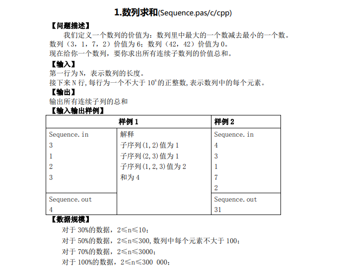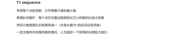 1 #include<bits/stdc++.h> 2 #define ll long long 3 using namespace std; 4 inline ll re_ad() { 5 char ch=getchar(); ll x=0,f=1; 6 while(ch<'0' || ch>'9') { if(ch=='-') f=-1; ch=getchar(); } 7 while('0'<=ch && ch<='9') x=(x<<1)+(x<<3)+ch-'0',ch=getchar(); 8 return x*f; 9 } 10 11 const ll N=3e5+11; 12 ll n,a[N],top,sta[N],L[N][2],R[N][2]; 13 14 int main() 15 { 16 freopen("sequence.in","r",stdin); 17 freopen("sequence.out","w",stdout); 18 n=re_ad(); 19 for(ll i=1;i<=n;++i) a[i]=re_ad(); 20 memset(sta,0,sizeof(sta)); top=0,sta[0]=0; 21 for(ll i=1;i<=n;++i) { 22 while(top && a[i]<a[sta[top]]) --top; 23 L[i][0]=i-sta[top],sta[++top]=i; 24 } 25 memset(sta,0,sizeof(sta)); top=0,sta[0]=n+1; 26 for(ll i=n;i>=1;--i) { 27 while(top && a[i]<=a[sta[top]]) --top; 28 R[i][0]=sta[top]-i,sta[++top]=i; 29 } 30 memset(sta,0,sizeof(sta)); top=0,sta[0]=0; 31 for(ll i=1;i<=n;++i) { 32 while(top && a[i]>=a[sta[top]]) --top; 33 L[i][1]=i-sta[top],sta[++top]=i; 34 } 35 memset(sta,0,sizeof(sta)); top=0,sta[0]=n+1; 36 for(ll i=n;i>=1;--i) { 37 while(top && a[i]>a[sta[top]]) --top; 38 R[i][1]=sta[top]-i,sta[++top]=i; 39 } 40 ll ans=0; 41 for(ll i=1;i<=n;++i) ans+=(L[i][1]*R[i][1]-1)*a[i],ans-=(L[i][0]*R[i][0]-1)*a[i]; 42 printf("%lld\n",ans); 43 // for(ll i=1;i<=n;++i) printf("%lld: %lld %lld %lld %lld\n",i,L[i][0],R[i][0],L[i][1],R[i][1]); 44 return 0; 45 }