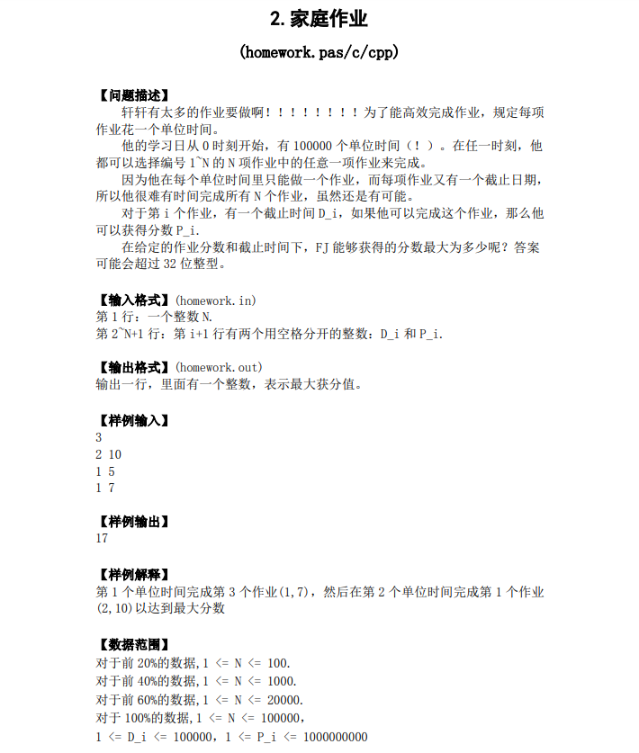 1 #include<bits/stdc++.h> 2 #define ll long long 3 #define pll pair<ll,ll> 4 using namespace std; 5 inline ll re_ad() { 6 char ch=getchar(); ll x=0,f=1; 7 while(ch<'0' || ch>'9') { if(ch=='-') f=-1; ch=getchar(); } 8 while('0'<=ch && ch<='9') x=(x<<1)+(x<<3)+ch-'0',ch=getchar(); 9 return x*f; 10 } 11 12 const ll N=2e5+11; 13 ll n; 14 struct Node { ll x,y; }a[N]; 15 priority_queue<ll>q; 16 inline bool cmp(Node A,Node B) { return A.x==B.x?A.y>B.y:A.x<B.x; } 17 18 int main() 19 { 20 freopen("homework.in","r",stdin); 21 freopen("homework.out","w",stdout); 22 n=re_ad(); 23 for(ll i=1;i<=n;++i) a[i].x=re_ad(),a[i].y=re_ad(); 24 sort(a+1,a+n+1,cmp); 25 ll cnt=0,ans=0; 26 for(ll i=1;i<=n;++i) { 27 if(a[i].x>cnt) q.push(-a[i].y),++cnt,ans+=a[i].y; 28 else if(a[i].y>-q.top()) ans+=a[i].y+q.top(),q.pop(),q.push(-a[i].y); 29 } 30 printf("%lld\n",ans); 31 return 0; 32 }