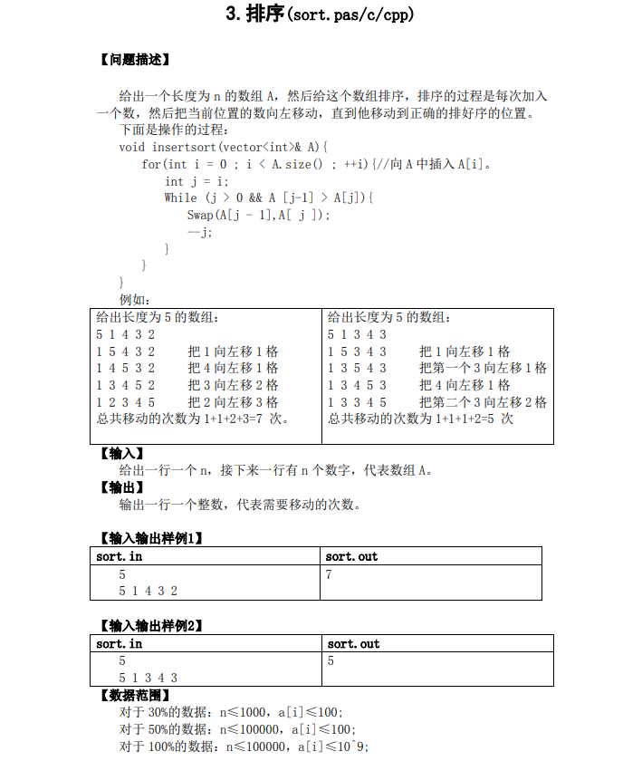 1 #include<bits/stdc++.h> 2 #define ll long long 3 using namespace std; 4 inline ll re_ad() { 5 char ch=getchar(); ll x=0,f=1; 6 while(ch<'0' || ch>'9') { if(ch=='-') f=-1; ch=getchar(); } 7 while('0'<=ch && ch<='9') x=(x<<1)+(x<<3)+ch-'0',ch=getchar(); 8 return x*f; 9 } 10 11 const ll N=5e5+11; 12 ll n,num,a[N],b[N],t[N]; 13 14 inline ll lowbit(ll d) { return d&(-d); } 15 inline void insert(ll d,ll x) { for(;d<=num;d+=lowbit(d)) t[d]+=x; } 16 inline ll query(ll d) { ll res=0; for(;d;d-=lowbit(d)) res+=t[d]; return res; } 17 18 int main() 19 { 20 freopen("sort.in","r",stdin); 21 freopen("sort.out","w",stdout); 22 n=re_ad(); 23 for(ll i=1;i<=n;++i) b[i]=a[i]=re_ad(); 24 sort(b+1,b+n+1); 25 num=unique(b+1,b+n+1)-b-1; 26 for(ll i=1;i<=n;++i) a[i]=lower_bound(b+1,b+num+1,a[i])-b; 27 ll ans=0; 28 for(ll i=n;i>=1;--i) ans+=query(a[i]-1),insert(a[i],1); 29 printf("%lld\n",ans); 30 return 0; 31 }