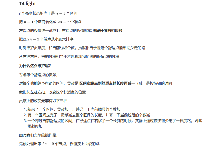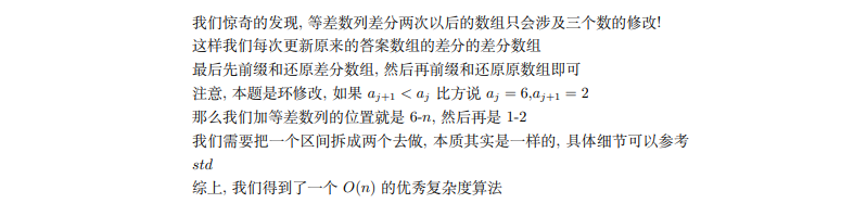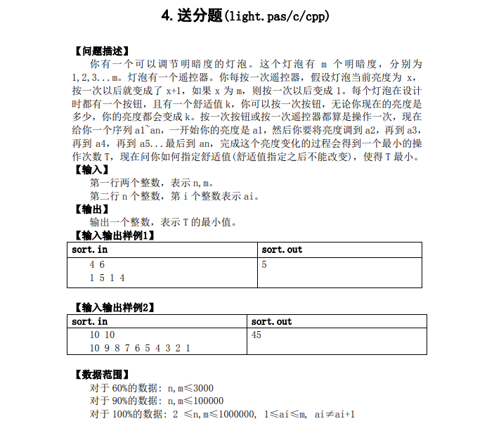 1 #include<bits/stdc++.h> 2 #define ll long long 3 using namespace std; 4 inline ll re_ad() { 5 char ch=getchar(); ll x=0,f=1; 6 while(ch<'0' || ch>'9') { if(ch=='-') f=-1; ch=getchar(); } 7 while('0'<=ch && ch<='9') x=(x<<1)+(x<<3)+ch-'0',ch=getchar(); 8 return x*f; 9 } 10 11 const ll N=2e6+11,inf=0x3f3f3f3f3f3f3f3f; 12 ll n,m,a[N],tot,dp[N],sum; 13 struct Node { ll pos,val; }t[N]; 14 15 namespace F1 { 16 inline void Solve() { 17 ll ans=inf,res=0; 18 for(ll i=1;i<=m;++i) { 19 res=0; 20 for(ll j=2;j<=n;++j) { 21 ll t1=(a[j-1]<a[j]?a[j]-a[j-1]:a[j]+m-a[j-1]); 22 ll t2=(i<=a[j]?a[j]-i:a[j]+m-i)+1; 23 res+=min(t1,t2); 24 // if(i==4) printf("%lld %lld %lld\n",t1,t2,res); 25 } 26 // printf("%lld: %lld\n",i,res); 27 ans=min(ans,res); 28 } 29 printf("%lld\n",ans); 30 } 31 } 32 33 inline void addnode(ll _p,ll _v) { ++tot,t[tot].pos=_p,t[tot].val=_v; } 34 inline bool cmp(Node A,Node B) { return A.pos==B.pos?A.val<B.val:A.pos<B.pos; } 35 36 int main() 37 { 38 freopen("light.in","r",stdin); 39 freopen("light.out","w",stdout); 40 n=re_ad(),m=re_ad(); 41 for(ll i=1;i<=n;++i) a[i]=re_ad(); 42 if(n<=3e3 && m<=3e3) { F1::Solve(); return 0; } 43 for(ll i=1;i<=n-1;++i) { 44 if(a[i+1]>a[i]) addnode(a[i],1),addnode(a[i+1],a[i]-a[i+1]),sum+=a[i+1]-a[i]; 45 else addnode(a[i],1),addnode(a[i+1]+m,a[i]-a[i+1]-m),sum+=a[i+1]+m-a[i]; 46 // printf("%lld\n",sum); 47 } 48 sort(t+1,t+tot+1,cmp); 49 // for(ll i=1;i<=tot;++i) printf("%lld: %lld\n",t[i].pos,t[i].val); 50 ll top=1,lj=0,cnt=0,ans=0; 51 for(ll i=1;i<=m*2;++i) { 52 for(;top<=tot && t[top].pos<=i;++top) 53 t[top].val>0?++cnt:(--cnt,lj+=t[top].val); 54 lj+=cnt,dp[i]=lj-cnt; 55 // printf("%lld: %lld %lld %lld\n",i,top,cnt,lj); 56 } 57 for(ll i=1;i<=m;++i) ans=max(ans,dp[i]+dp[i+m]); 58 printf("%lld\n",sum-ans); 59 // printf("sum,ans: %lld %lld\n",sum,ans); 60 return 0; 61 }