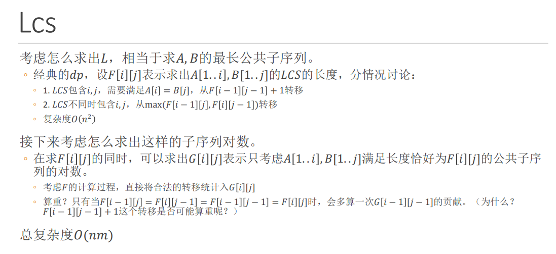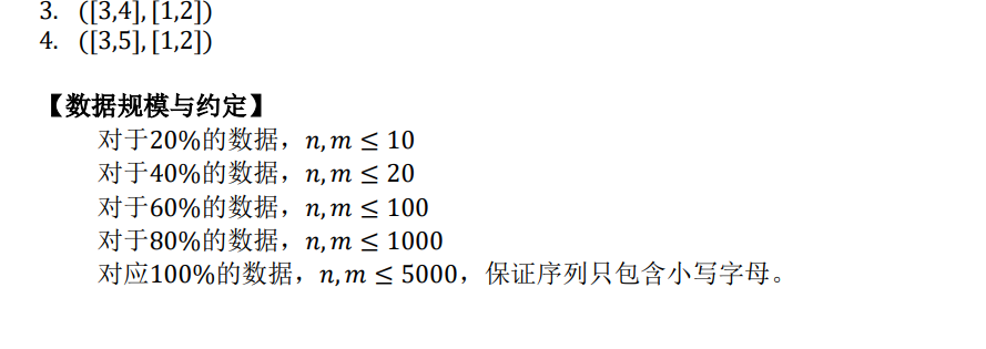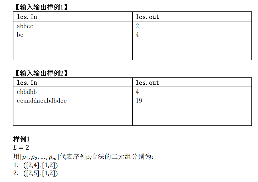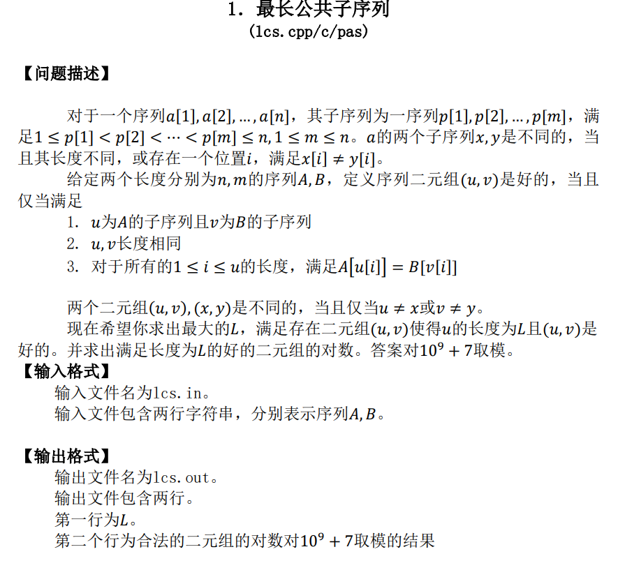 1 #include<bits/stdc++.h> 2 using namespace std; 3 const int N=5011,mod=1e9+7; 4 int n,m,dp[N][N],g[N][N]; 5 char s[N],t[N]; 6 int main() 7 { 8 scanf("%s",s+1); scanf("%s",t+1); 9 n=strlen(s+1),m=strlen(t+1); 10 g[0][0]=1; for(int i=1;i<=n;++i) g[0][i]=g[i][0]=1; 11 for(int i=1;i<=n;++i) for(int j=1;j<=m;++j) { 12 g[i][j]=0; 13 if(dp[i-1][j]<dp[i][j-1]) dp[i][j]=dp[i][j-1],g[i][j]=g[i][j-1]; 14 else if(dp[i-1][j]>dp[i][j-1]) dp[i][j]=dp[i-1][j],g[i][j]=g[i-1][j]; 15 else { 16 dp[i][j]=dp[i-1][j],g[i][j]=(g[i-1][j]+g[i][j-1])%mod; 17 if(dp[i-1][j-1]==dp[i][j-1]) (g[i][j]+=mod-g[i-1][j-1])%=mod; 18 } 19 20 // dp[i][j]=max(dp[i-1][j],dp[i][j-1]); 21 // if(dp[i][j]==dp[i-1][j]) (g[i][j]+=g[i-1][j])%=mod; 22 // if(dp[i][j]==dp[i][j-1]) (g[i][j]+=g[i][j-1])%=mod; 23 // if(dp[i][j]==dp[i][j-1] && dp[i][j]==dp[i-1][j] && dp[i][j]==dp[i-`][j-1]) (g[i][j]+=mod-g[i-1][j-1])%=mod; 24 25 if(s[i]==t[j]) { 26 if(dp[i][j]<dp[i-1][j-1]+1) dp[i][j]=dp[i-1][j-1]+1,g[i][j]=g[i-1][j-1]; 27 else if(dp[i][j]==dp[i-1][j-1]+1) (g[i][j]+=g[i-1][j-1])%=mod; 28 } 29 } 30 /* for(int i=1;i<=n;++i) { 31 for(int j=1;j<=m;++j) printf("%d ",dp[i][j]); 32 puts(""); 33 } 34 for(int i=1;i<=n;++i) { 35 for(int j=1;j<=m;++j) printf("%d ",g[i][j]); 36 puts(""); 37 } 38 */ 39 printf("%d\n",dp[n][m]); 40 printf("%d\n",g[n][m]); 41 return 0; 42 }
