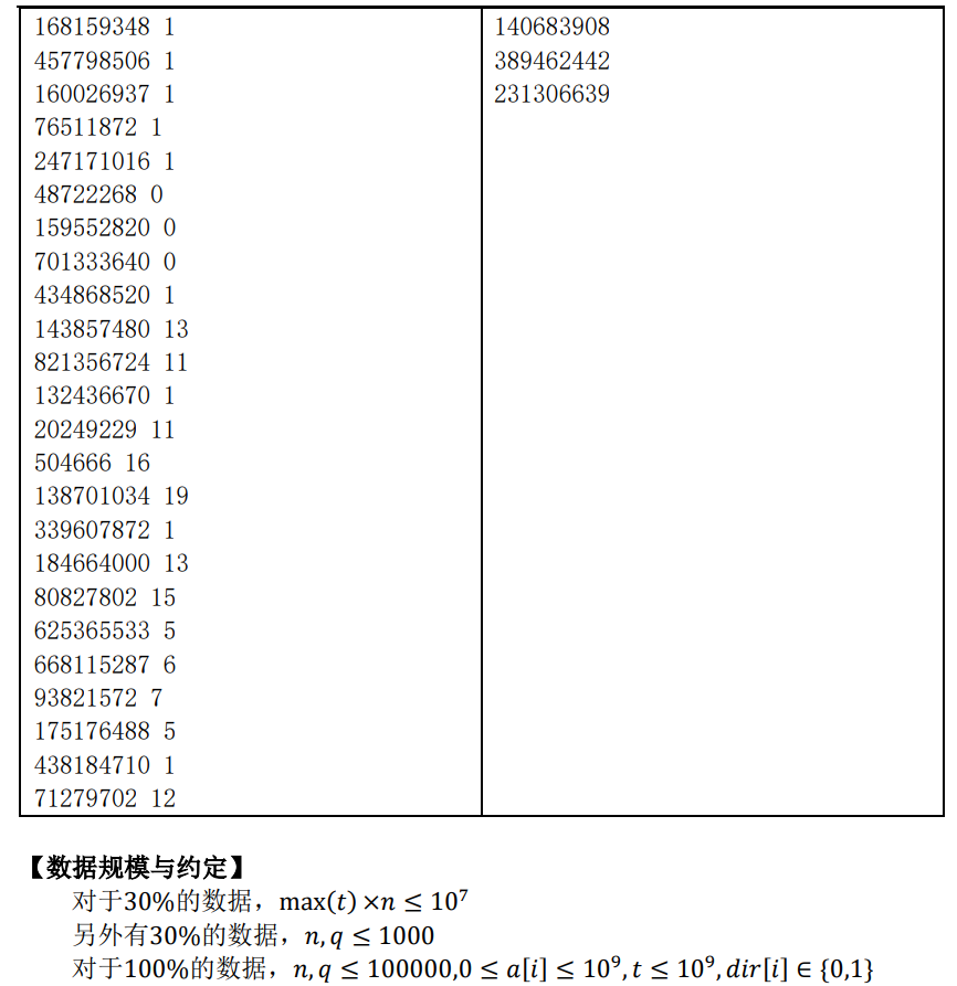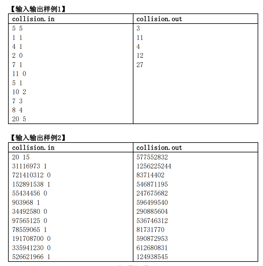 1 #include<bits/stdc++.h> 2 #define ll long long 3 using namespace std; 4 const int N=100011; 5 int n,q,tota,totb; 6 ll a[N],b[N]; 7 8 struct Node { 9 int pos,rank,num; 10 bool operator < (const Node &d) const { 11 return pos<d.pos; 12 } 13 }; 14 Node t[N]; 15 16 inline int dabs(int d) { return d>0?d:-d; } 17 18 int main() 19 { 20 int tm,op,dir,ans=0; 21 scanf("%d%d",&n,&q); 22 for(int i=1;i<=n;++i) { 23 scanf("%d%d",&t[i].pos,&dir); 24 t[i].num=i; 25 (dir) ? a[++tota]=t[i].pos : b[++totb]=t[i].pos; 26 } 27 sort(t+1,t+n+1); 28 for(int i=1;i<=n;++i) t[t[i].num].rank=i; 29 sort(a+1,a+tota+1); 30 sort(b+1,b+totb+1); 31 while(q--) { 32 scanf("%d%d",&tm,&op); 33 op=t[op].rank; 34 ll l=-2e9,r=2e9; 35 while(l<=r) { 36 ll mid=(l+r)>>1; 37 int res=upper_bound(a+1,a+tota+1,mid-tm)-a-1; 38 res+=upper_bound(b+1,b+totb+1,mid+tm)-b-1; 39 if(res>=op) ans=mid,r=mid-1; 40 else l=mid+1; 41 } 42 printf("%d\n",dabs(ans)); 43 } 44 return 0; 45 }