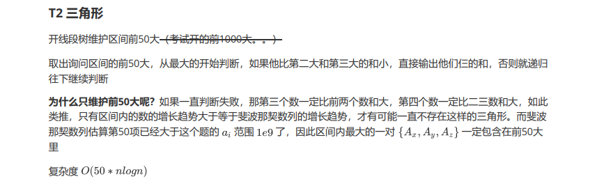 1 #include<bits/stdc++.h> 2 using namespace std; 3 const int N=3e5+11,M=61,St=50; 4 int n,m,a[N]; 5 6 inline int re_ad() { 7 char ch=getchar(); int x=0,f=1; 8 while(ch<'0' || ch>'9') { if(ch=='-') f=-1; ch=getchar(); } 9 while('0'<=ch && ch<='9') x=(x<<1)+(x<<3)+ch-'0',ch=getchar(); 10 return x*f; 11 } 12 13 struct Node { 14 int len,val[M]; 15 Node Init() { len=0; for(int i=1;i<=St;++i) val[i]=0; } 16 Node operator + (const Node &B) const { 17 int d1=1,d2=1; 18 Node res; res.len=len+B.len; 19 for(int i=1;i<=St;++i) { 20 if(d1>len && d2>B.len) return res; 21 if(d1>len) res.val[i]=B.val[d2++]; 22 else if(d2>B.len) res.val[i]=val[d1++]; 23 else if(val[d1]>B.val[d2]) res.val[i]=val[d1++]; 24 else res.val[i]=B.val[d2++]; 25 } 26 return res; 27 } 28 }; 29 30 namespace ST { 31 Node t[N]; 32 inline void Pushup(int d) { 33 t[d]=t[d<<1]+t[d<<1|1]; 34 } 35 void build(int d,int l,int r) { 36 t[d].Init(); t[d].len=r-l+1; 37 if(l==r) { t[d].val[1]=a[l]; return ; } 38 int mid=(l+r)>>1; 39 build(d<<1,l,mid); 40 build(d<<1|1,mid+1,r); 41 Pushup(d); 42 } 43 inline void Build() { build(1,1,n); } 44 void modify(int d,int l,int r,int x,int z) { 45 if(l==r) { t[d].val[1]=z; return ; } 46 int mid=(l+r)>>1; 47 (x<=mid)?modify(d<<1,l,mid,x,z):modify(d<<1|1,mid+1,r,x,z); 48 Pushup(d); 49 } 50 inline void Modify(int x,int z) { modify(1,1,n,x,z); } 51 Node query(int d,int l,int r,int x,int y) { 52 Node res; res.Init(); 53 if(x>y || l>r) return res; 54 if(x<=l && r<=y) return t[d]; 55 int mid=(l+r)>>1; 56 if(x<=mid) res=res+query(d<<1,l,mid,x,y); 57 if(y>=mid+1) res=res+query(d<<1|1,mid+1,r,x,y); 58 return res; 59 } 60 inline void Query(int x,int y) { 61 Node tmp=query(1,1,n,x,y); 62 // printf("query: %d %d: %d: %d %d %d %d %d\n",x,y,tmp.len,tmp.val[1],tmp.val[2],tmp.val[3],tmp.val[4],tmp.val[5]); 63 if(tmp.len<3) { printf("0\n"); return ; } 64 for(int i=1;i<=tmp.len-2;++i) if(tmp.val[i]<tmp.val[i+1]+tmp.val[i+2]) 65 { printf("%d\n",tmp.val[i]+tmp.val[i+1]+tmp.val[i+2]); return ; } 66 printf("0\n"); 67 } 68 /* 69 void print_search(int d,int l,int r) { 70 printf("%d %d %d: %d: %d %d %d %d %d\n",d,l,r,t[d].len,t[d].val[1],t[d].val[2],t[d].val[3],t[d].val[4],t[d].val[5]); 71 if(l==r) return ; 72 int mid=(l+r)>>1; 73 print_search(d<<1,l,mid),print_search(d<<1|1,mid+1,r); 74 } 75 inline void Print_Test() { 76 print_search(1,1,n); 77 } 78 */ 79 } 80 81 int main() 82 { 83 n=re_ad(),m=re_ad(); 84 for(int i=1;i<=n;++i) a[i]=re_ad(); 85 ST::Build(); 86 // ST::Print_Test(); 87 for(int i=1,op,x,y;i<=m;++i) { 88 op=re_ad(),x=re_ad(),y=re_ad(); 89 // if(op==2) ST::Query(x,y); 90 op==1 ? ST::Modify(x,y) : ST::Query(x,y); 91 // ST::Print_Test(); 92 } 93 return 0; 94 }
