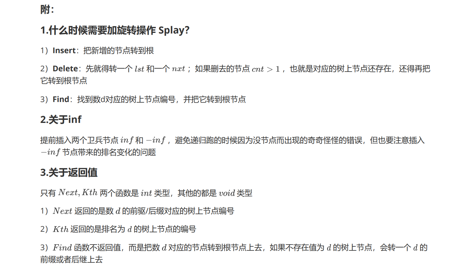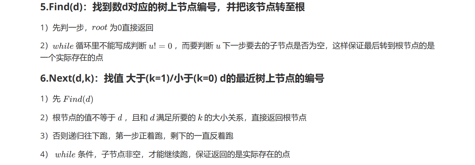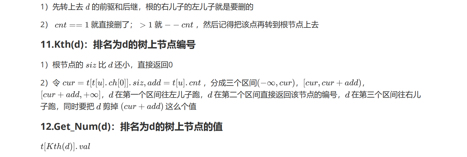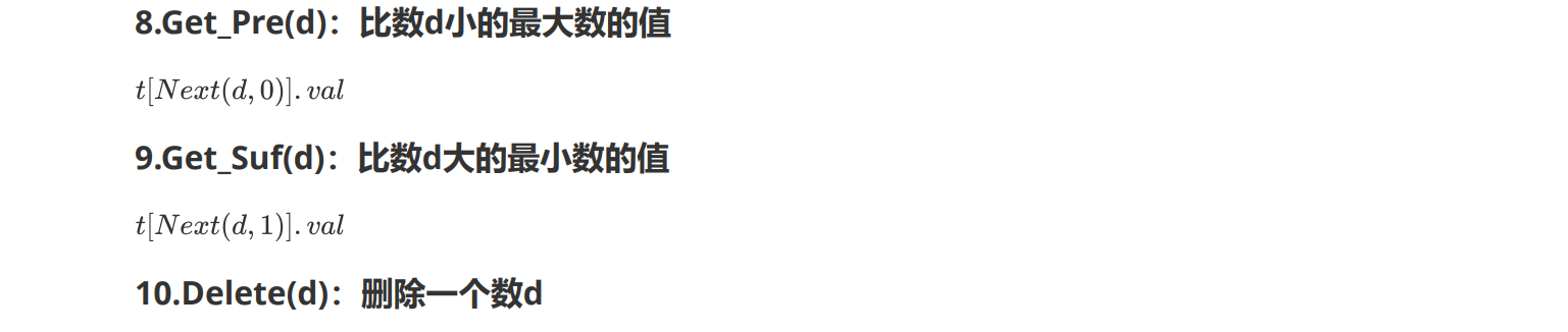 1 #include<bits/stdc++.h> 2 using namespace std; 3 const int N=1e5+11,Tree_Sz=1e5+11,inf=1<<29; 4 int n; 5 6 inline int re_ad() { 7 char ch=getchar(); int x=0,f=1; 8 while(ch<'0' || ch>'9') { if(ch=='-') f=-1; ch=getchar(); } 9 while('0'<=ch && ch<='9') x=(x<<1)+(x<<3)+ch-'0',ch=getchar(); 10 return x*f; 11 } 12 13 namespace ST { 14 int root,tot; 15 struct Node { 16 int fa,val,cnt,siz,ch[2]; 17 }t[Tree_Sz]; 18 inline void Pushup(int d) { 19 t[d].siz=t[t[d].ch[0]].siz+t[t[d].ch[1]].siz+t[d].cnt; 20 } 21 inline void Rotate(int x) { 22 int y=t[x].fa,z=t[y].fa; 23 int k1=(t[y].ch[1]==x),k2=(t[z].ch[1]==y); 24 t[t[x].ch[k1^1]].fa=y; 25 t[y].ch[k1]=t[x].ch[k1^1]; 26 t[y].fa=x; 27 t[x].ch[k1^1]=y; 28 t[x].fa=z; 29 t[z].ch[k2]=x; 30 Pushup(y),Pushup(x); 31 } 32 inline void Splay(int x,int f) { 33 while(t[x].fa!=f) { 34 int y=t[x].fa,z=t[y].fa; 35 if(z!=f) (t[y].ch[1]==x)^(t[z].ch[1]==y)?Rotate(x):Rotate(y); 36 Rotate(x); 37 } 38 if(!f) root=x; 39 } 40 inline void Insert(int d) { 41 int u=root,f=0; 42 while(u && t[u].val!=d) f=u,u=t[u].ch[d>t[u].val]; 43 if(u) ++t[u].cnt; 44 else { 45 u=++tot; 46 if(f) t[f].ch[d>t[f].val]=u; 47 t[u].fa=f,t[u].val=d; 48 t[u].cnt=t[u].siz=1; 49 t[u].ch[0]=t[u].ch[1]=0; 50 } 51 Splay(u,0); 52 } 53 inline void Find(int d) { 54 int u=root; 55 if(!u) return ; 56 while(t[u].ch[d>t[u].val] && t[u].val!=d) u=t[u].ch[d>t[u].val]; 57 Splay(u,0); 58 } 59 inline int Next(int d,int k) { 60 Find(d); 61 int u=root; 62 if(t[u].val<d && !k) return u; 63 if(t[u].val>d && k) return u; 64 u=t[u].ch[k]; 65 while(t[u].ch[k^1]) u=t[u].ch[k^1]; 66 return u; 67 } 68 inline void Get_Rank(int d) { 69 Find(d); 70 int u=t[root].ch[0]; 71 printf("%d\n",t[u].siz); 72 } 73 inline void Get_Pre(int d) { 74 printf("%d\n",t[Next(d,0)].val); 75 } 76 inline void Get_Suf(int d) { 77 printf("%d\n",t[Next(d,1)].val); 78 } 79 inline void Delete(int d) { 80 int lst=Next(d,0),nxt=Next(d,1); 81 Splay(lst,0),Splay(nxt,lst); 82 int u=t[nxt].ch[0]; 83 if(t[u].cnt>1) --t[u].cnt,Splay(u,0); 84 else t[nxt].ch[0]=0; 85 } 86 inline int Kth(int d) { 87 int u=root; 88 if(t[u].siz<d) return 0; 89 while(1) { 90 int cur=t[t[u].ch[0]].siz,add=t[u].cnt; 91 if(d<cur) u=t[u].ch[0]; 92 else if(d<cur+add) return u; 93 else d-=cur+add,u=t[u].ch[1]; 94 } 95 } 96 inline void Get_Num(int d) { 97 printf("%d\n",t[Kth(d)].val); 98 } 99 } 100 101 int main() 102 { 103 n=re_ad(); 104 ST::Insert(inf),ST::Insert(-inf); 105 for(int i=1,op,x;i<=n;++i) { 106 op=re_ad(),x=re_ad(); 107 if(op==1) ST::Insert(x); 108 else if(op==2) ST::Delete(x); 109 else if(op==3) ST::Get_Rank(x); 110 else if(op==4) ST::Get_Num(x); 111 else if(op==5) ST::Get_Pre(x); 112 else if(op==6) ST::Get_Suf(x); 113 } 114 return 0; 115 }