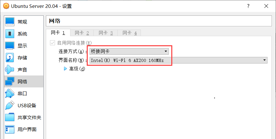 首先在虚拟机设置界面中将网络连接模式设置为“桥接网卡”,同时选择你的物理机上网所用的网卡,我这里是使用的无线网卡,故选择“Intel(R) Wi-Fi 6 AX200 160MHz”这一项