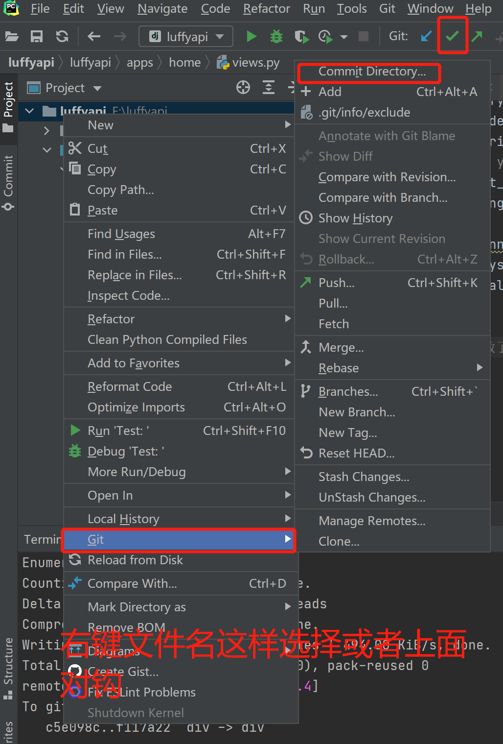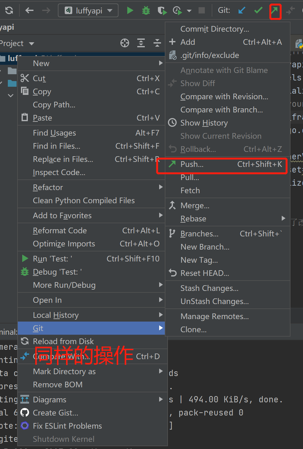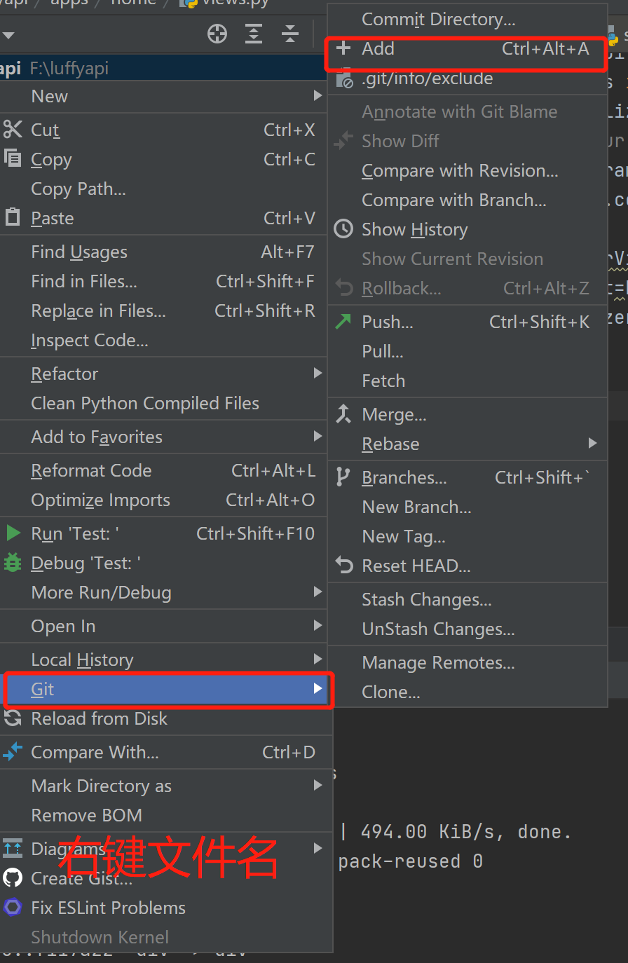 # 1 创建远程仓库luffy_api---【非空】 # 2 git clone https://gitee.com/liuqingzheng/luffy_api.git # 把远程仓库内容克隆到本地 # 3 把我们项目的代码,copy到 luffy_api这个文件夹下(.git文件夹不要copy) # 4 git add . # 5 git commit -m ‘初始化仓库’ # 6 git push origin master # 以后,完成了项目的某个功能就要执行下面的命令,以后你在公司中得开发提交步骤 -git add . -git commit -m '完成了xx功能,修改了xx文件。。。。' # 提交到了本地仓库 -每次提交【推到远端】代码之前,要拉取一下代码---》没事你就拉去一下,保证本地的版本库一直跟远端保存一样----以后冲突会变少 -git pull origin master -git push origin master # 把本地的mater分支推送到远端origin对应的地址-【可能推不上去】 -如果推不上去,说明本地不是最新版本,一定下拉去一下,成了最新版本再去提交