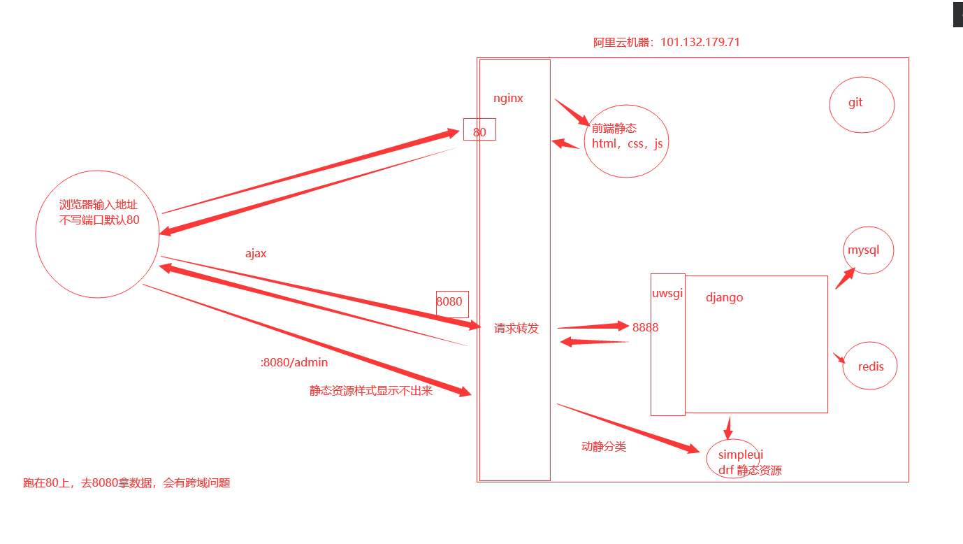 # 1 把logs做成了包 -忽略掉日志文件后,空文件夹不会被git管理,做成包后会被管理,咱们需要logs文件夹 # 2 新建了一个manage_pro.py -服务端,迁移数据库,如果执行 python manage.py migrate 使用的数据库是测试环境 -服务端使用manage_pro.py,迁移到正式的数据库中 # 3 migrations 中得修改记录要不要提交到git -官方建议:提交 -我建议:不要提 -改了后,有记录 -服务端: python manage.py makemigrations python manage.py migrate -假设: 本地张三在user表增加了一个字段,migrations记录 本地张三在user表增加了一个字段,migrations记录 提到远端,服务端看到两个变更记录 服务端只需要执行python manage.py migrate -我的建议: 本地张三在user表增加了一个字段,migrations记录 本地张三在user表增加了一个字段,migrations记录 不提到远端,服务端没有变更记录 服务端只需要执行 python manage.py makemigrations 只生成一条 python manage.py migrate # 4 配置文件中得,后台和前台地址,修改,修改成上线服务器的地址,但是现在还没有 -在配置文件中配置好阿里云的地址 # 5 后端项目提交到git上 # 6 本地把前端项目打包:html,css,js -修改ajax的地址 export default { BASE_URL:'http://106.15.177.33:8080/api/v1/' } -编译 npm run build -项目路径下出现dist文件夹:html,css,js
