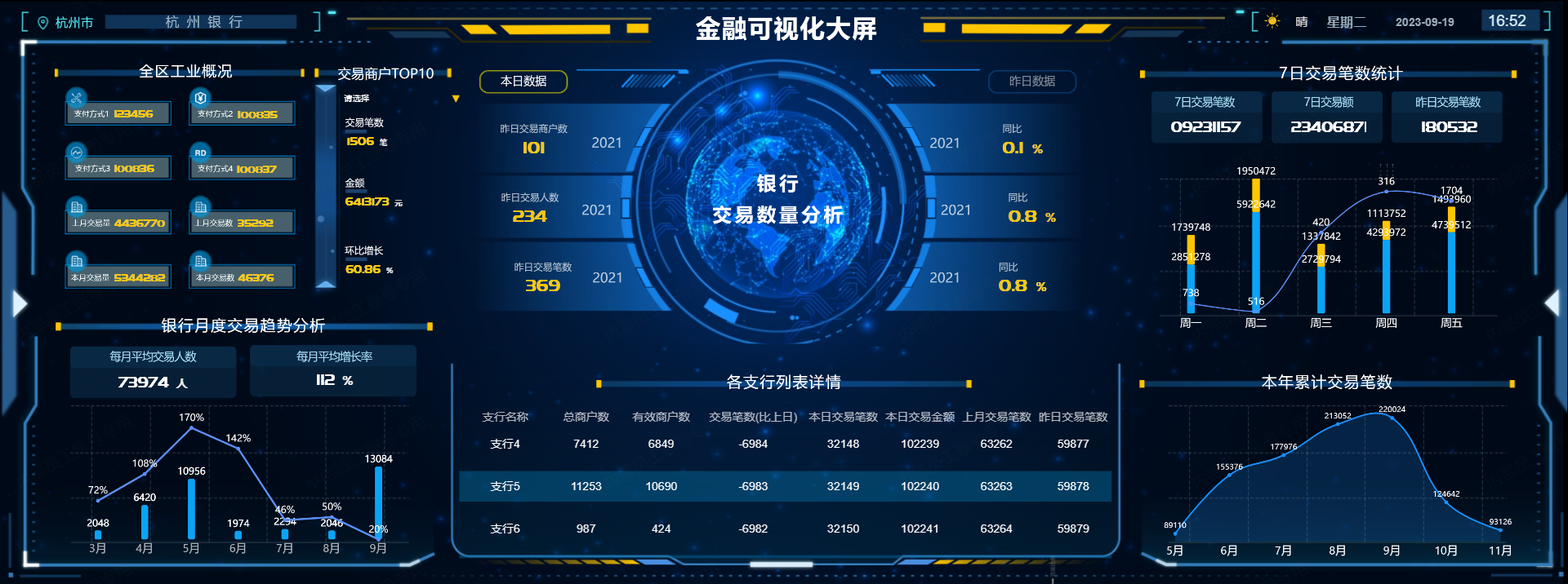 山海鲸银行可视化大屏是一项创新的银行信息化项目,旨在提供强大的数据可视化和监控功能,帮助银行更好地管理和优化其运营和服务。山海鲸可视化(https://www.shanhaibi.com/)为银行行业定制了多个可视化大屏:
