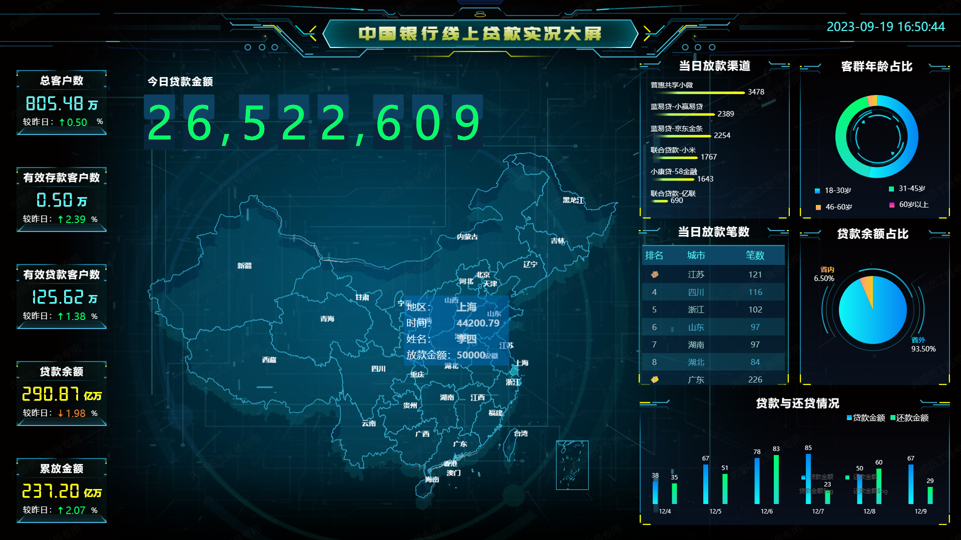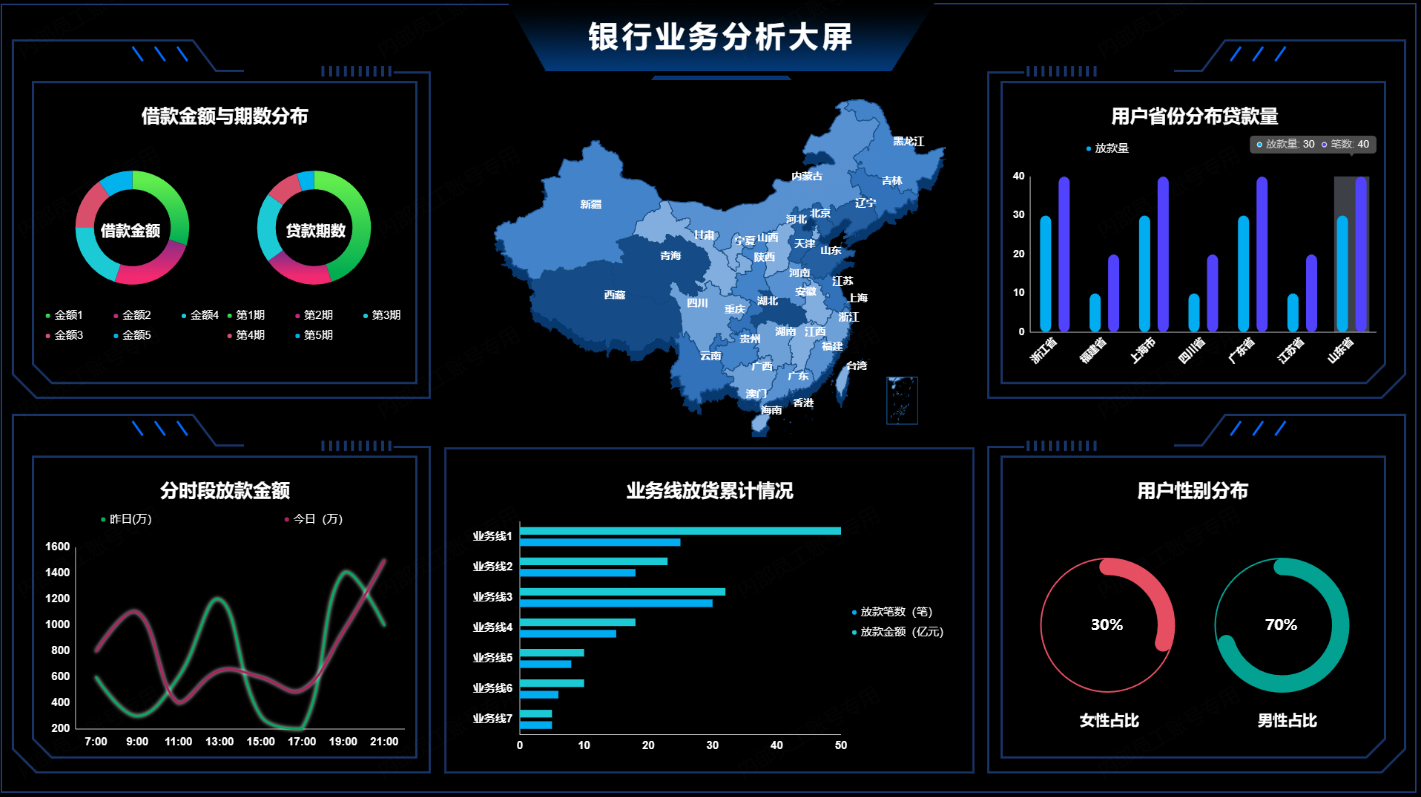 大屏效果展示(以山海鲸银行线上贷款实况大屏为例):