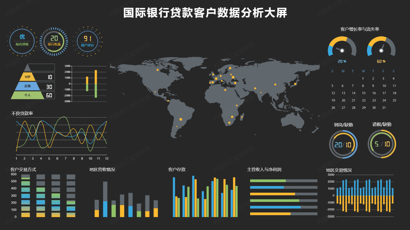 (二)山海鲸国际银行贷款客户数据分析大屏运用了堆叠柱状图、指标卡、仪表盘、折线图等组件,展示了国际银行的贷款客户分布情况以及平均不良贷款率,对客户的交易方式以及各类客户的存款总情况进行分析,并且通过对各地区的交易情况以及主营收入与净利润进行分析得出地区营收情况的分析。