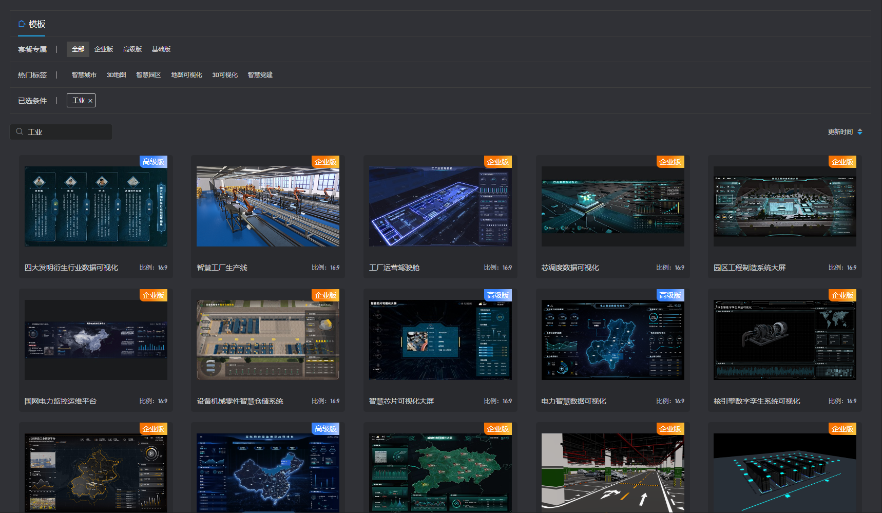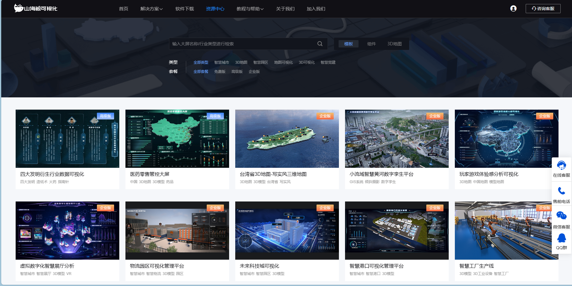 在山海鲸可视化的资源中心里内置了大量的二维、三维大屏模板,大家可以根据需要找到自己想要的模板,然后点击下载直接进行使用。