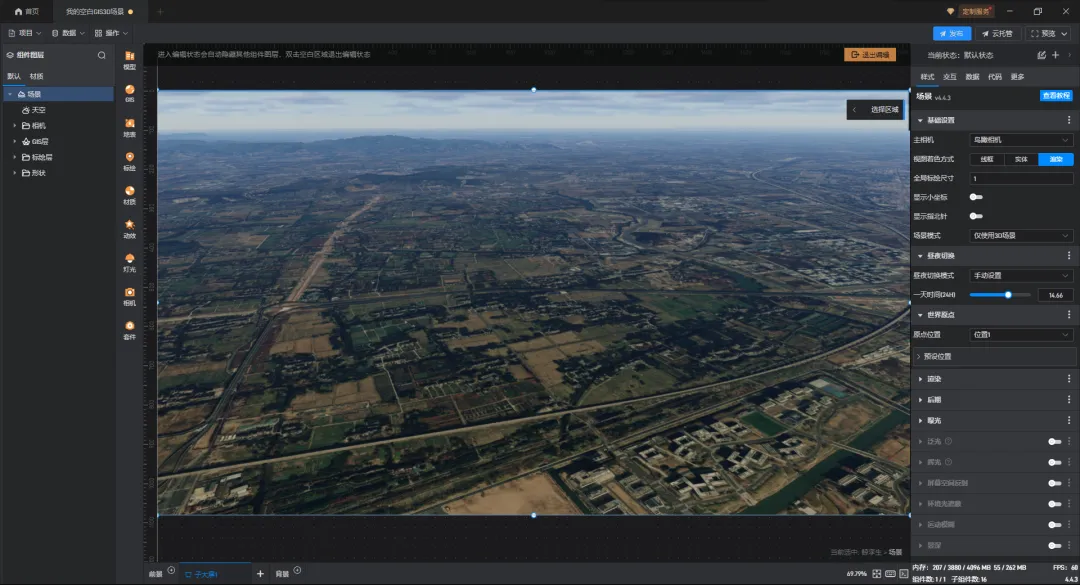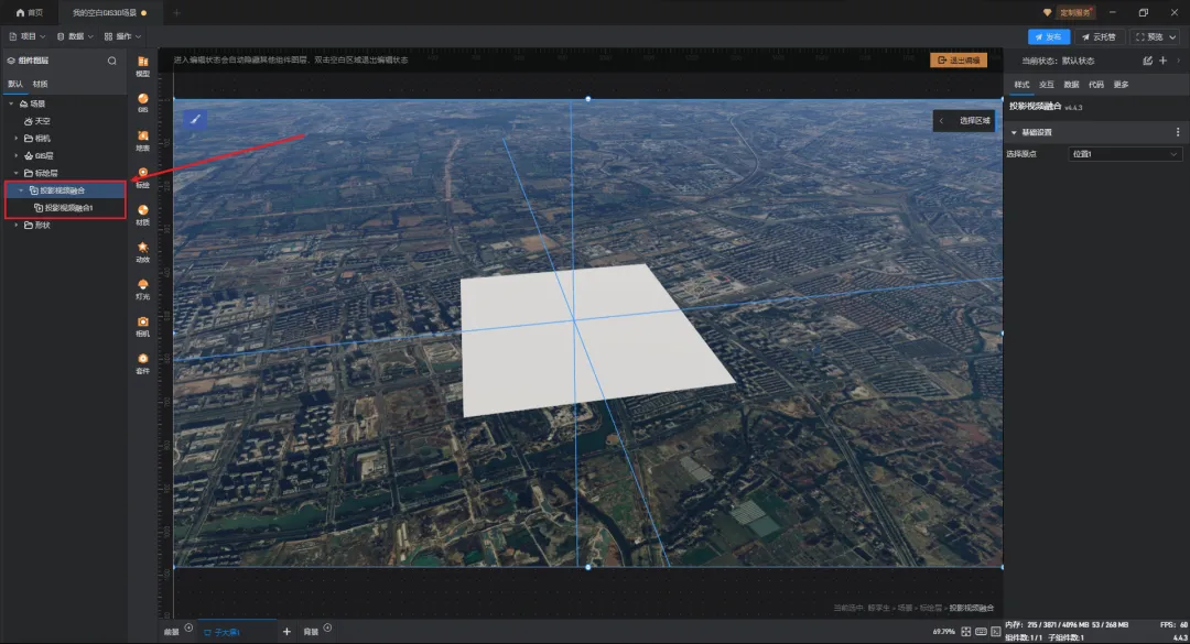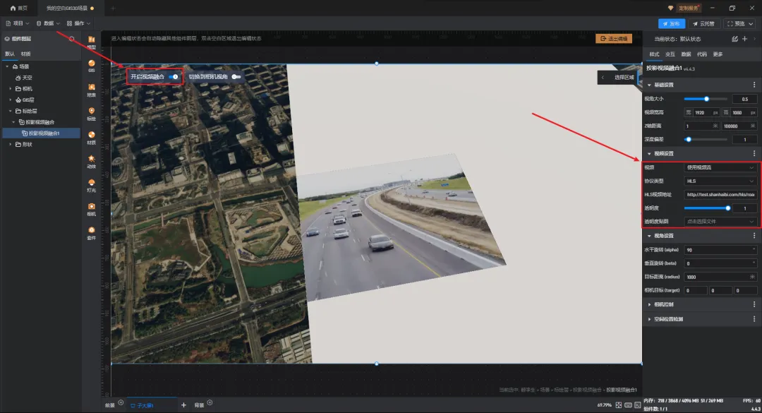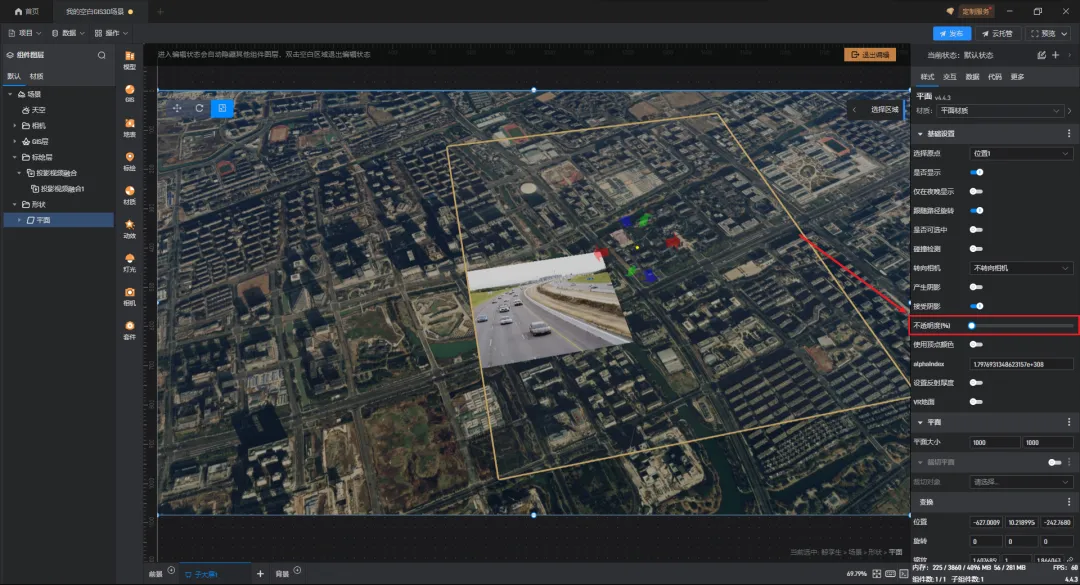 开启视频融合后,将平面的不透明度调整至透明,即可实现视频与场景的融合。