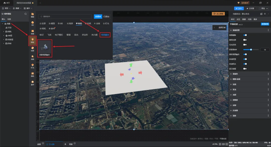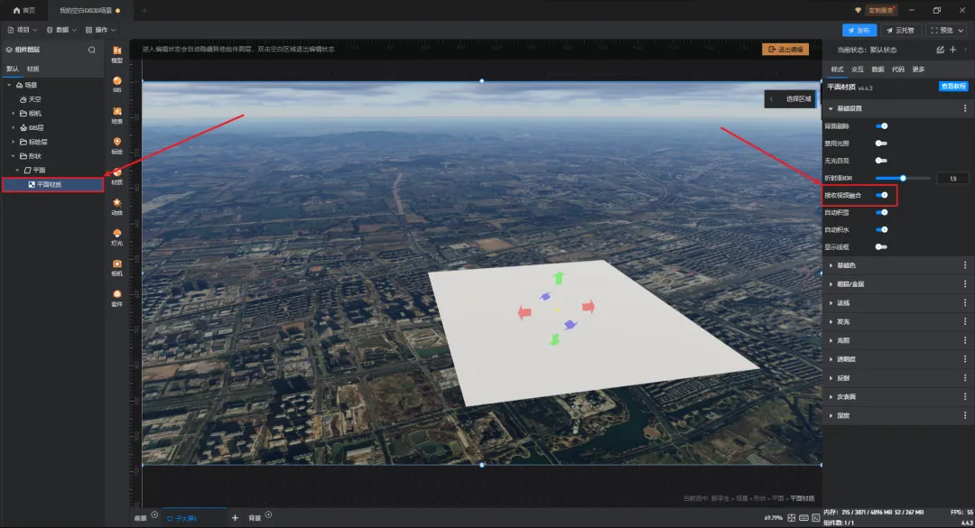 将平面添加至场景的合适位置后,点击“平面材质”,确保该平面接收视频融合。