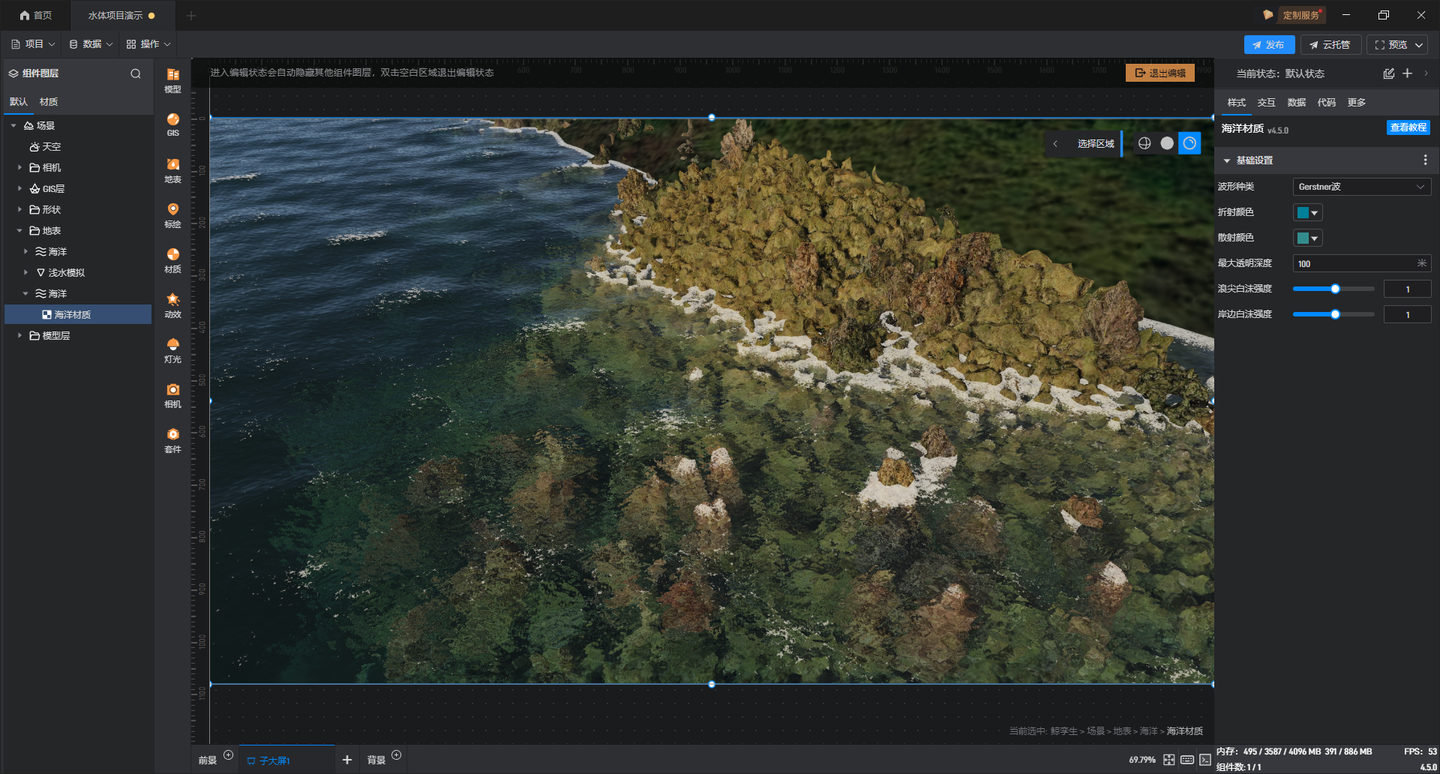 在此基础上再进一步结合我们前面的水体渲染效果,最终可以实现真实的水体模拟,我们可以通过下面这个视频来看看在山海鲸中浅水方程水体模拟如果设置来实现洪水或者大坝开闸这类试试的水体模拟需求: