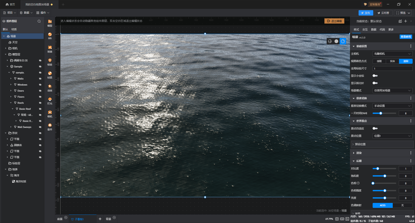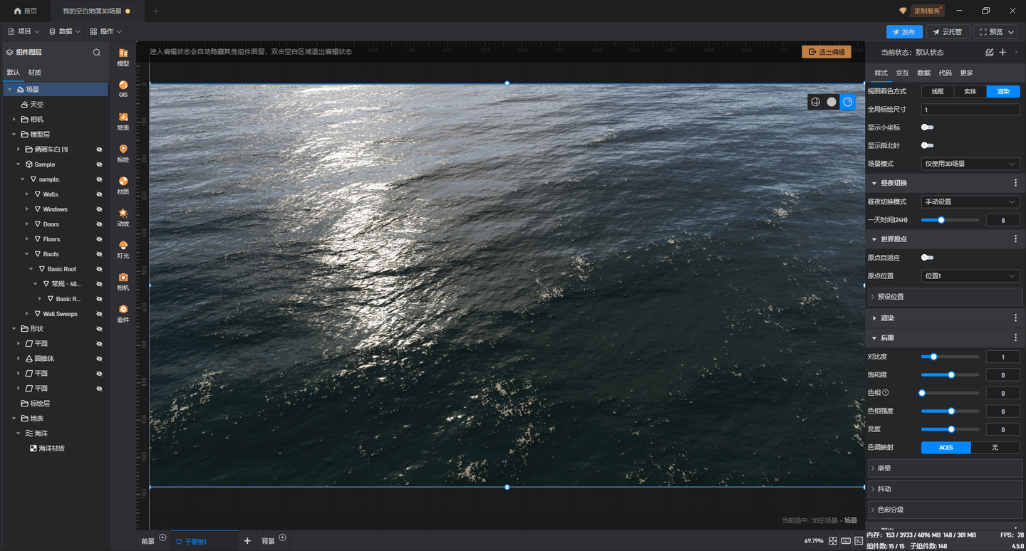 由于水利是数字孪生中非常重要的一个领域,因此水面的渲染和大气,云层一样,也是山海鲸的重点攻克的目标。经过了两年的打磨,和与真实项目的磨合,山海鲸目前围绕水的渲染,已经实现了从平面,到波形模拟,到浅水方程式,到粒子的全流程水效的技术实现和快速使用,我们可以看下山海鲸中的水的概览介绍: