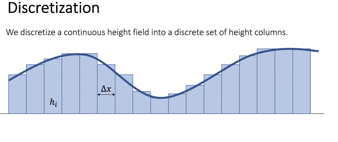 浅水方程式本身是一种对水体模拟的思路,本质呢就是毛星云提到的欧拉方法,把水体先简化为网格,然后再计算网格之间的互相作用。当然这里特别提到的浅水(shallow water)可以让我们只考虑水面的网格,这样把水体简化成一个一个的柱体。我们借用一下Games103课程PPT的内容可以更加直观的看到这样的简化:
