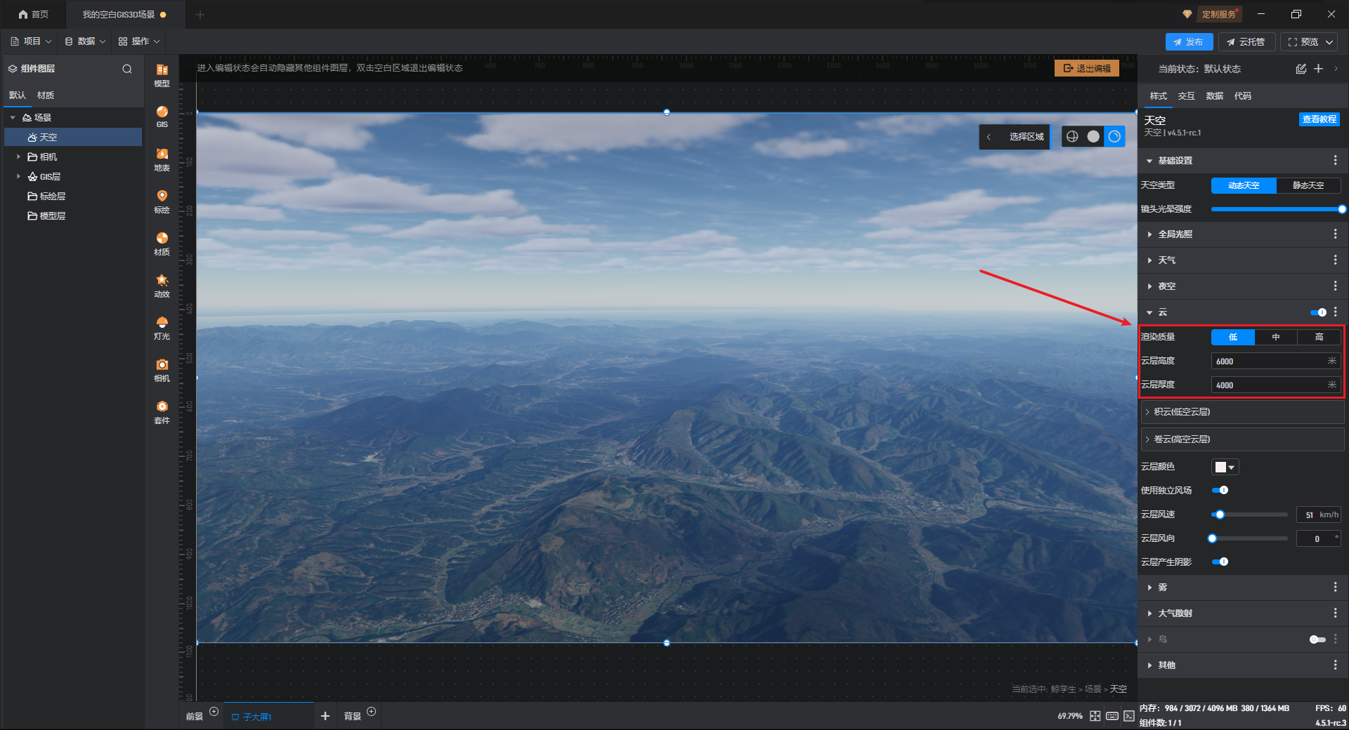在云的设置中,我们可以对云层的渲染质量、高度、厚度等进行设置。