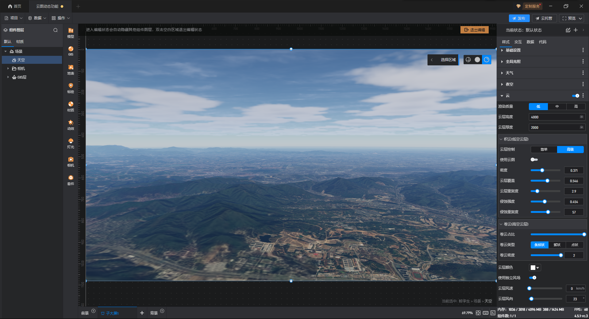 山海鲸可视化能够完美融合GIS与数字孪生,在GIS场景中进行实时三维渲染。体积云作为山海鲸可视化重点优化的一大特色功能,提供了包括积云、卷云等多种设置,能够帮助大家进一步将GIS场景与数字孪生三维渲染融合,实现更卓越的视觉效果。下面我们就来看看,如何在山海鲸可视化中设置体积云。