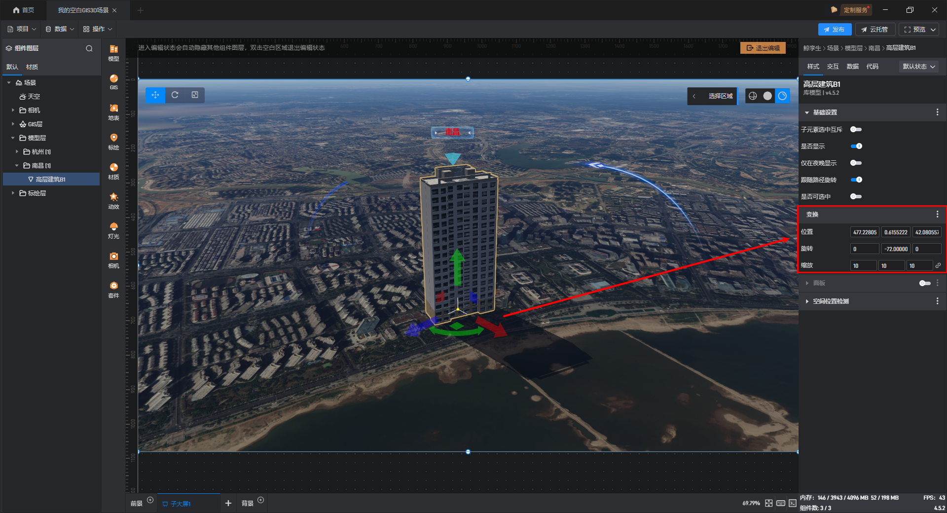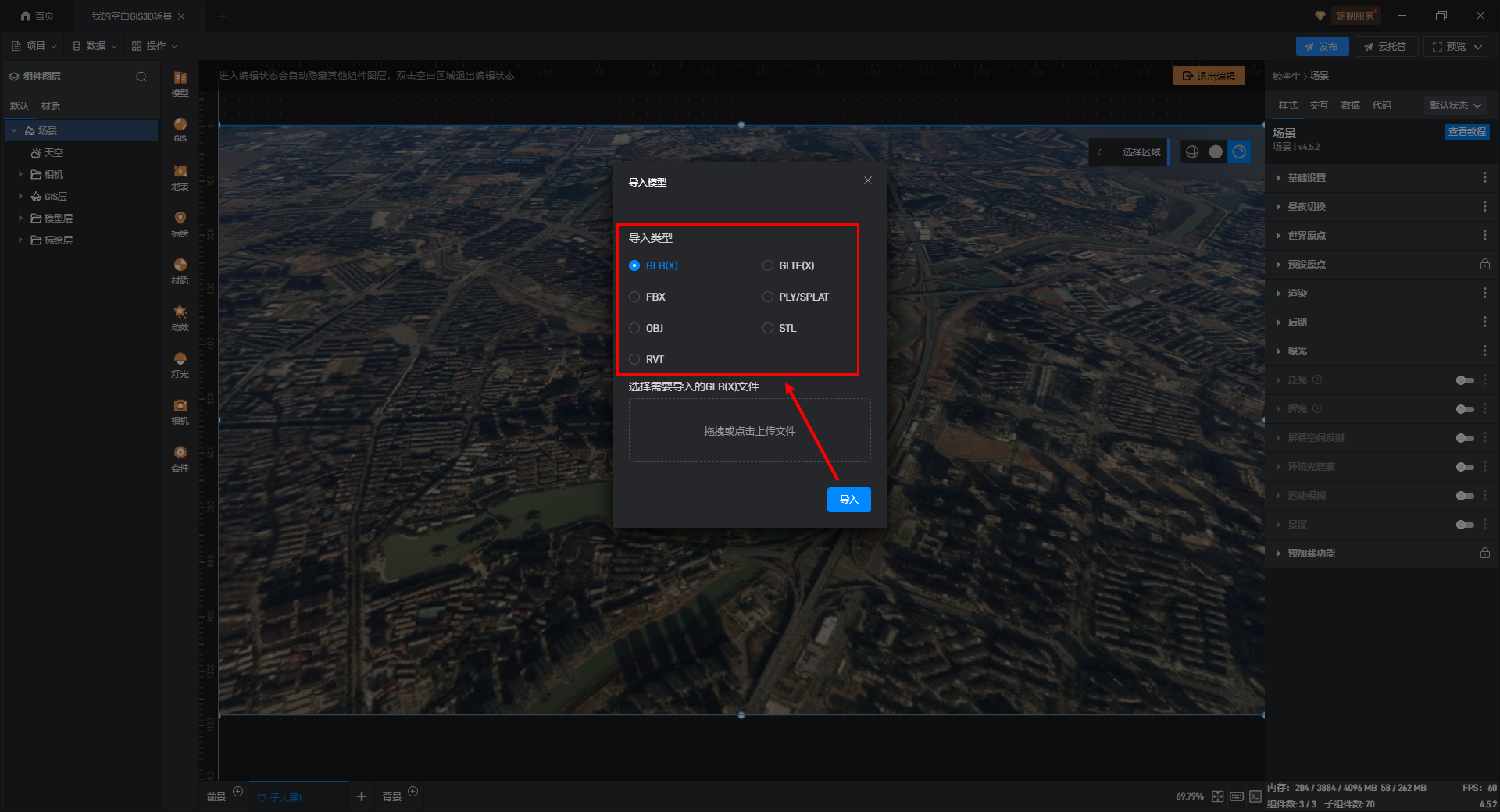 在山海鲸中双击进入鲸孪生组件的编辑模式,在左侧菜单栏中点击“模型”,然后点击下方的“+导入模型”即可导入模型文件,添加模型后选中模型就可以拖动箭头来进行平移、旋转等操作,也可以在右侧样式中填写数值。