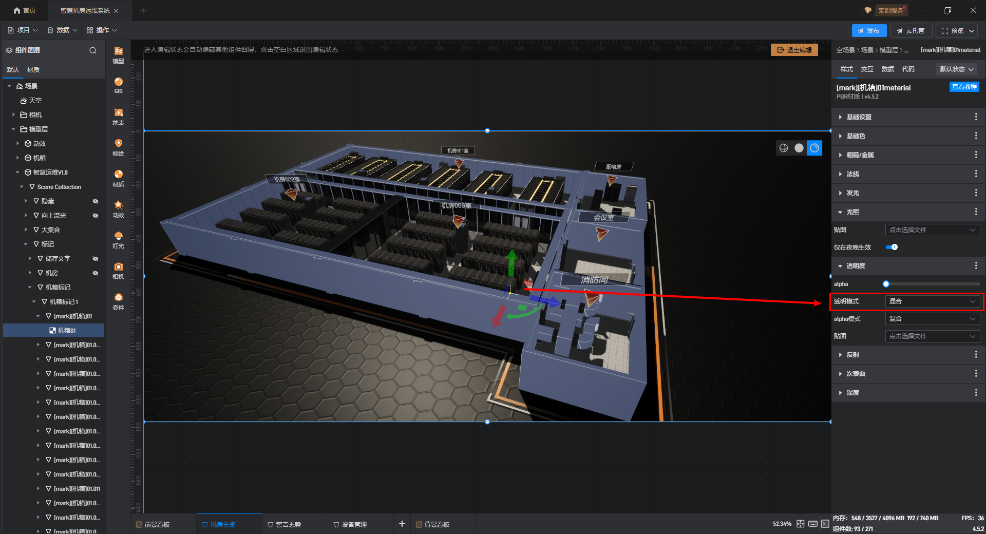 在组件图层里选中模型的材质,将样式中透明模式设置项更改为为“混合”,如下图所示: