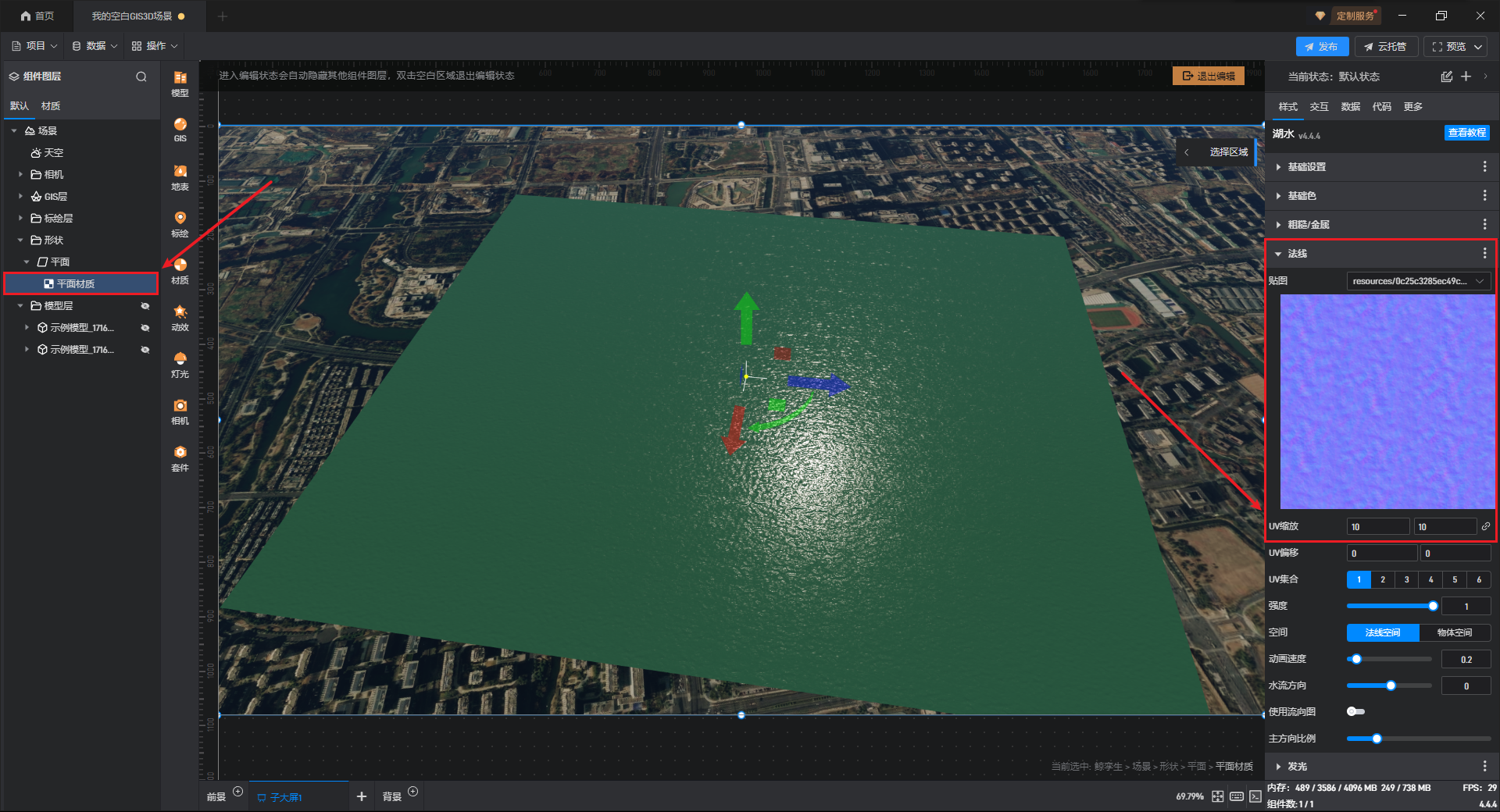 04 制作了一个水池模型,添加软件里的小河材质后,水波的效果不太明显应该怎么调整?