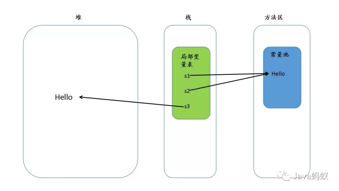 那为什么s3与s1、s2引用的不是同一个字符串地址呢? String s3=new String("Hello"); JVM首先是在字符串常量池中找"Hello" 字符串,如果没有创建字符串常量,然后放到常量池中,若已存在,则不需要创建;当遇到 new 时,还会在内存(不是字符串常量池中,而是在堆里面)上创建一个新的String对象,存储"Hello",并将内存上的String对象引用地址返回,所以s3与s1、s2引用的不是同一个字符串地址。内存结构图如下: