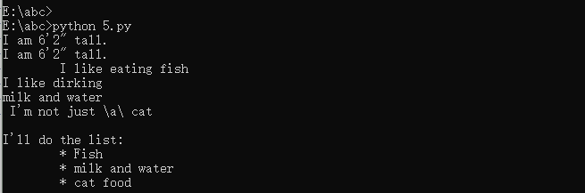 print("I am 6'2\" tall.") print('I am 6\'2" tall.') fat_cat="\tI like eating fish" white_cat="I like dirking \nmilk and water" black_cat=" I'm not just \\a\\ cat" green_cat=''' I'll do the list: \t* Fish \t* milk and water \t* cat food ''' print(fat_cat) print(white_cat) print(black_cat) print(green_cat)