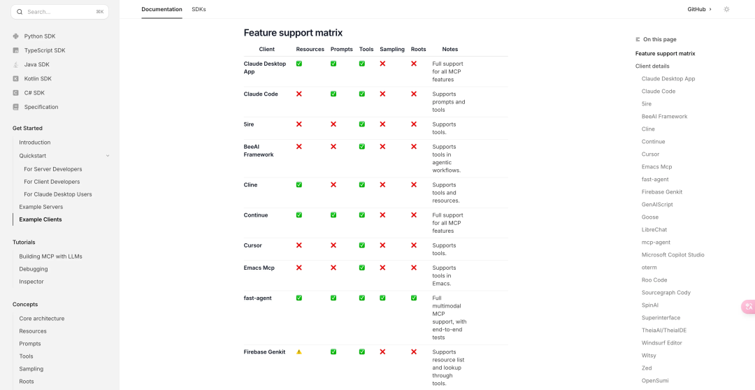 兼容性如下图,可以看到大部分工具都只是支持 MCP Tools 而已: