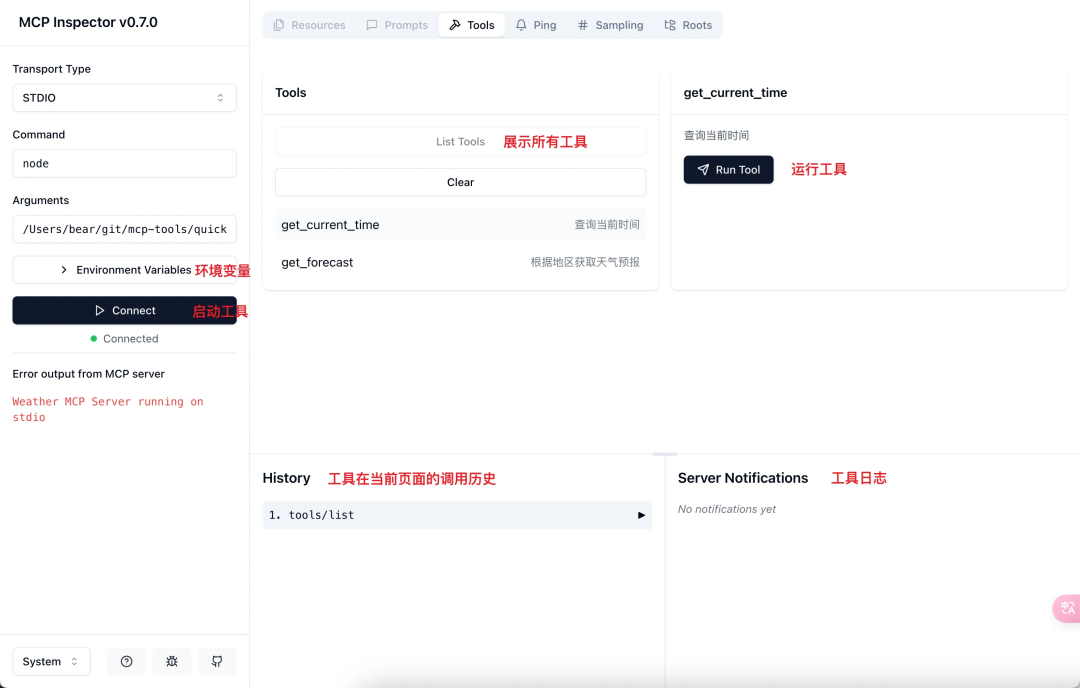 官方提供了一个调试工具,不过该工具更多的是围绕 MCP 协议本身的调试,调试界面如下图: