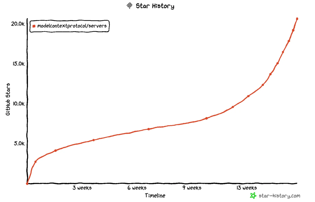 目前,MCP 还处于发展初期,但其潜力巨大。更重要的是生态,基于统一标准下构筑的生态也会正向的促进整个领域的发展。概念是 2024 年底才提出,几个月不到,在 GitHub 上的 Star 数已经突破 20K,可为相当火热。