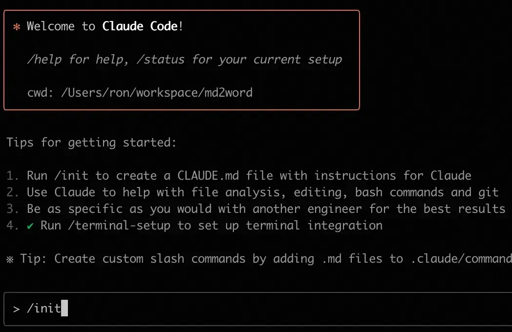 通过/init指令,可以让Claude Code扫描整个工程,了解项目结构,并将结果写入CLAUDE.md文件: