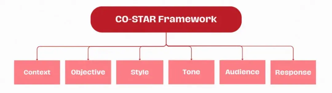 我比较喜欢使用COSTAR框架,他是2023年新加坡prompt大赛冠军总结出来的一个提示词编写框架,他将Prompt分成了Context、Objective、Style、Tone、Audience、Response这几个部分,分别表示任务的背景、agent的目标、风格、回复预期、受众以及响应格式要求。我经常会将style、tone、audience做一些修改,加入一些对agent的要求。