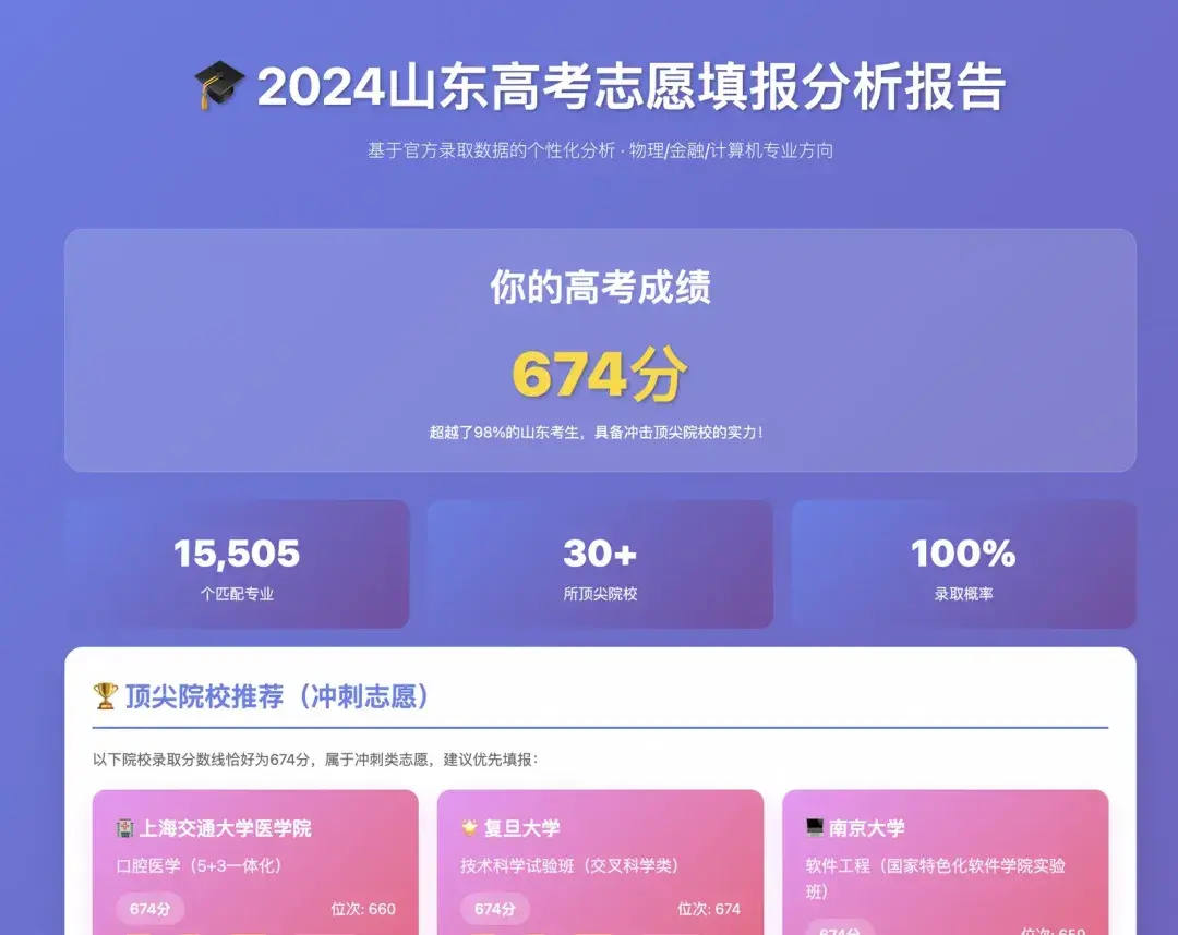 我今年考了674分,想在山东上大学,物理这门课考的比较好,喜欢金融/计算机相关的专业,请帮我分析一下应该怎么填报高考志愿. 结果帮我输出成html