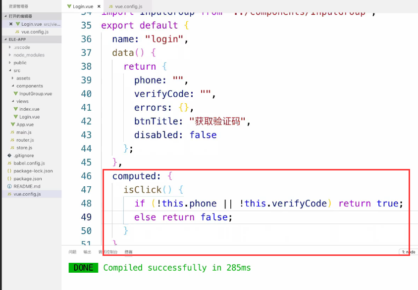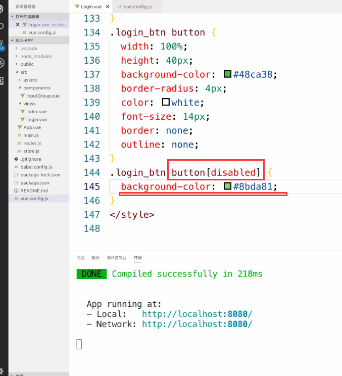 设置用户名和密码都输入时。登录按钮才由灰色变显色(其实实现方法有很多),使用:XXX的动态绑定,后面使用computed计算属性来逻辑判断地进行变化。