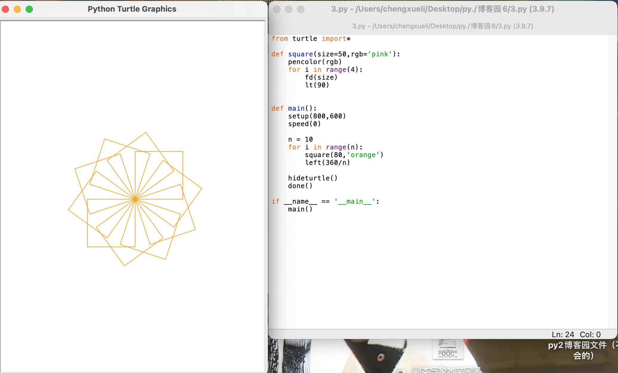 1 from turtle import* 2 3 def square(size=50,rgb='pink'): 4 pencolor(rgb) 5 for i in range(4): 6 fd(size) 7 lt(90) 8 9 10 def main(): 11 setup(800,600) 12 speed(0) 13 14 n = 10 15 for i in range(n): 16 square(80,'orange') 17 left(360/n) 18 19 hideturtle() 20 done() 21 22 if __name__ == '__main__': 23 main()