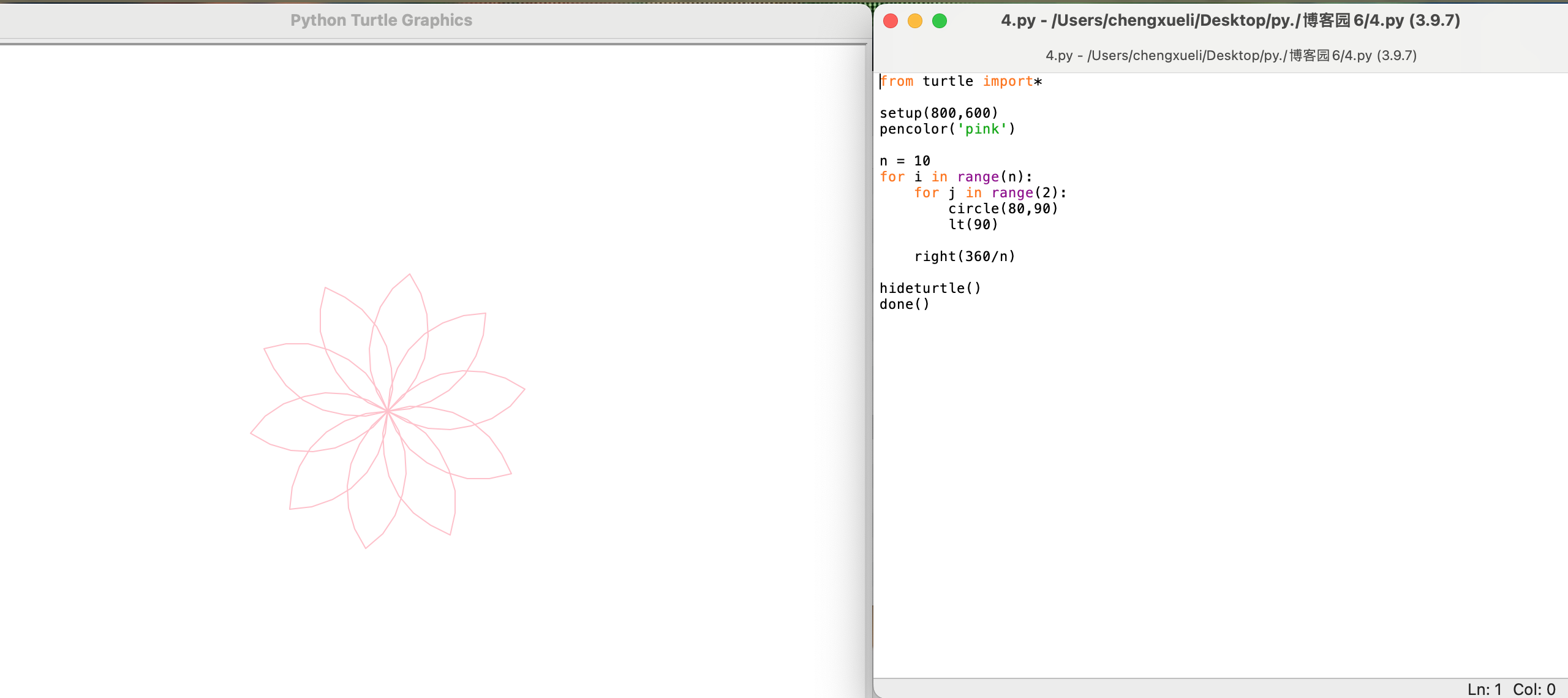 1 from turtle import* 2 3 setup(800,600) 4 pencolor('pink') 5 6 n = 10 7 for i in range(n): 8 for j in range(2): 9 circle(80,90) 10 lt(90) 11 12 right(360/n) 13 14 hideturtle() 15 done()