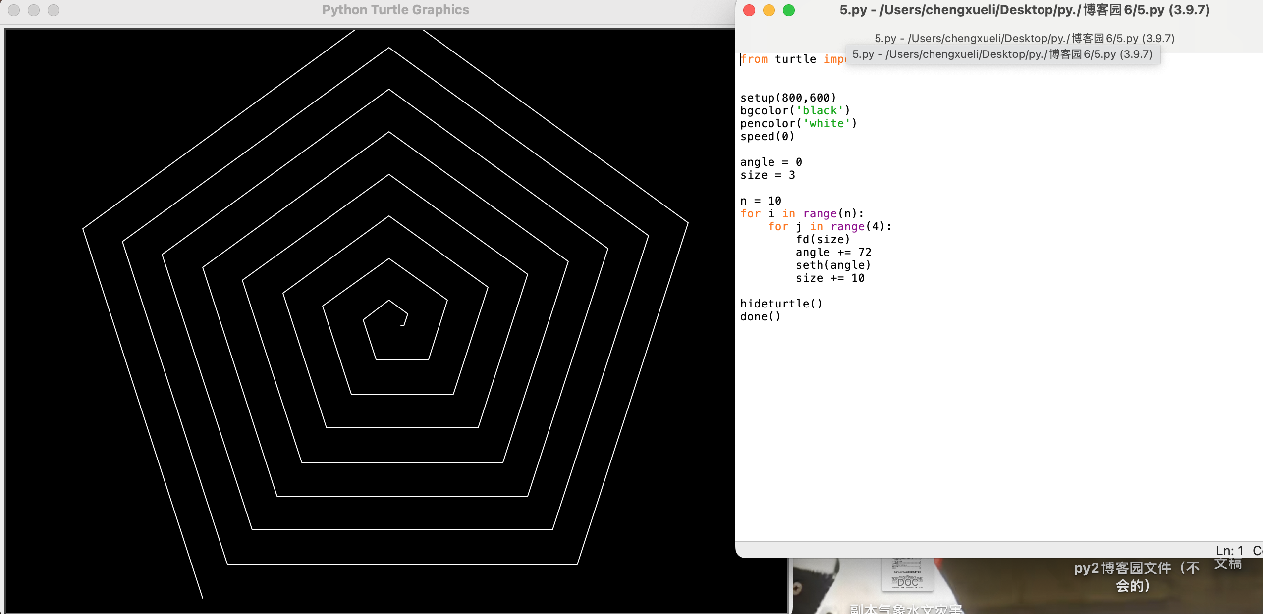 1 from turtle import* 2 3 4 setup(800,600) 5 bgcolor('black') 6 pencolor('white') 7 speed(0) 8 9 angle = 0 10 size = 3 11 12 n = 10 13 for i in range(n): 14 for j in range(4): 15 fd(size) 16 angle += 72 17 seth(angle) 18 size += 10 19 20 hideturtle() 21 done()