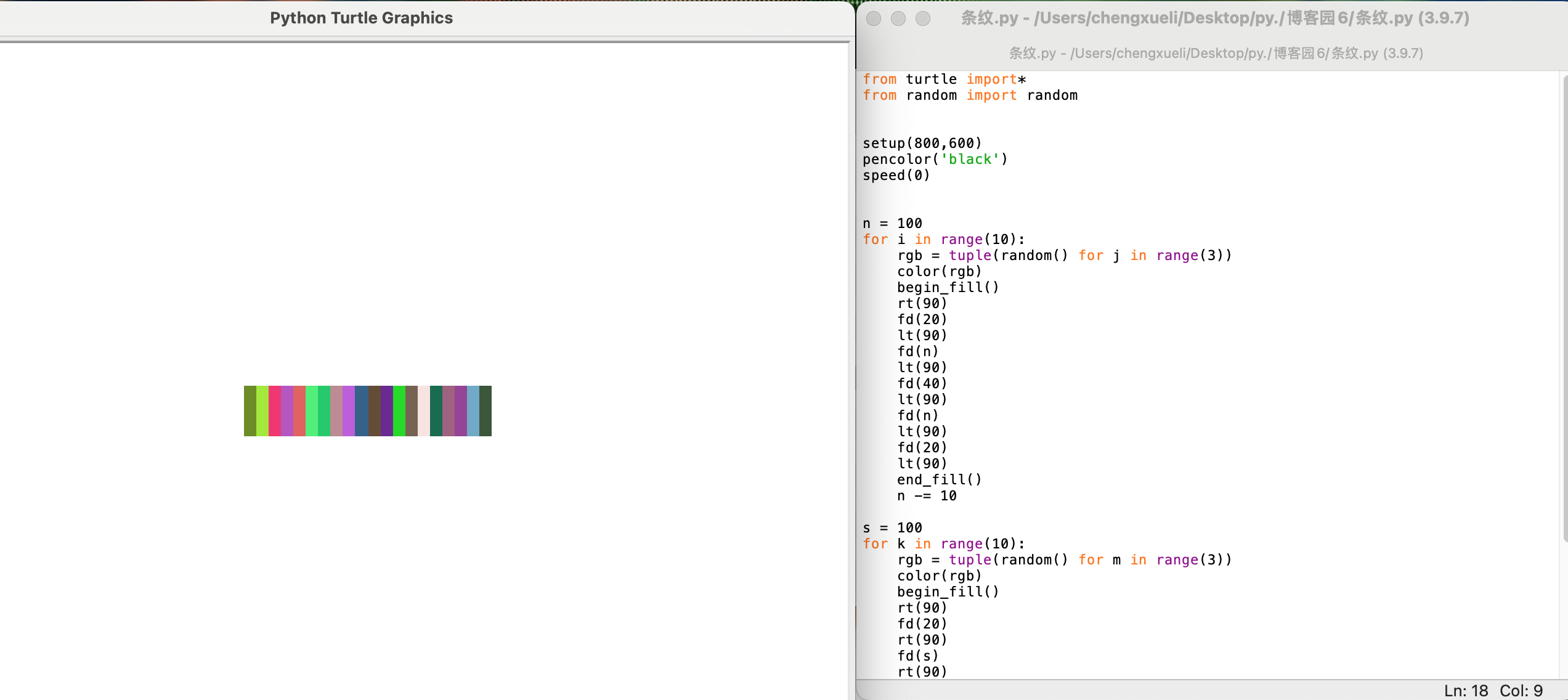 1 from turtle import* 2 from random import random 3 4 5 setup(800,600) 6 pencolor('black') 7 speed(0) 8 9 10 n = 100 11 for i in range(10): 12 rgb = tuple(random() for j in range(3)) 13 color(rgb) 14 begin_fill() 15 rt(90) 16 fd(20) 17 lt(90) 18 fd(n) 19 lt(90) 20 fd(40) 21 lt(90) 22 fd(n) 23 lt(90) 24 fd(20) 25 lt(90) 26 end_fill() 27 n -= 10 28 29 s = 100 30 for k in range(10): 31 rgb = tuple(random() for m in range(3)) 32 color(rgb) 33 begin_fill() 34 rt(90) 35 fd(20) 36 rt(90) 37 fd(s) 38 rt(90) 39 fd(40) 40 rt(90) 41 fd(s) 42 rt(90) 43 fd(20) 44 lt(90) 45 end_fill() 46 s -= 10 47 done()